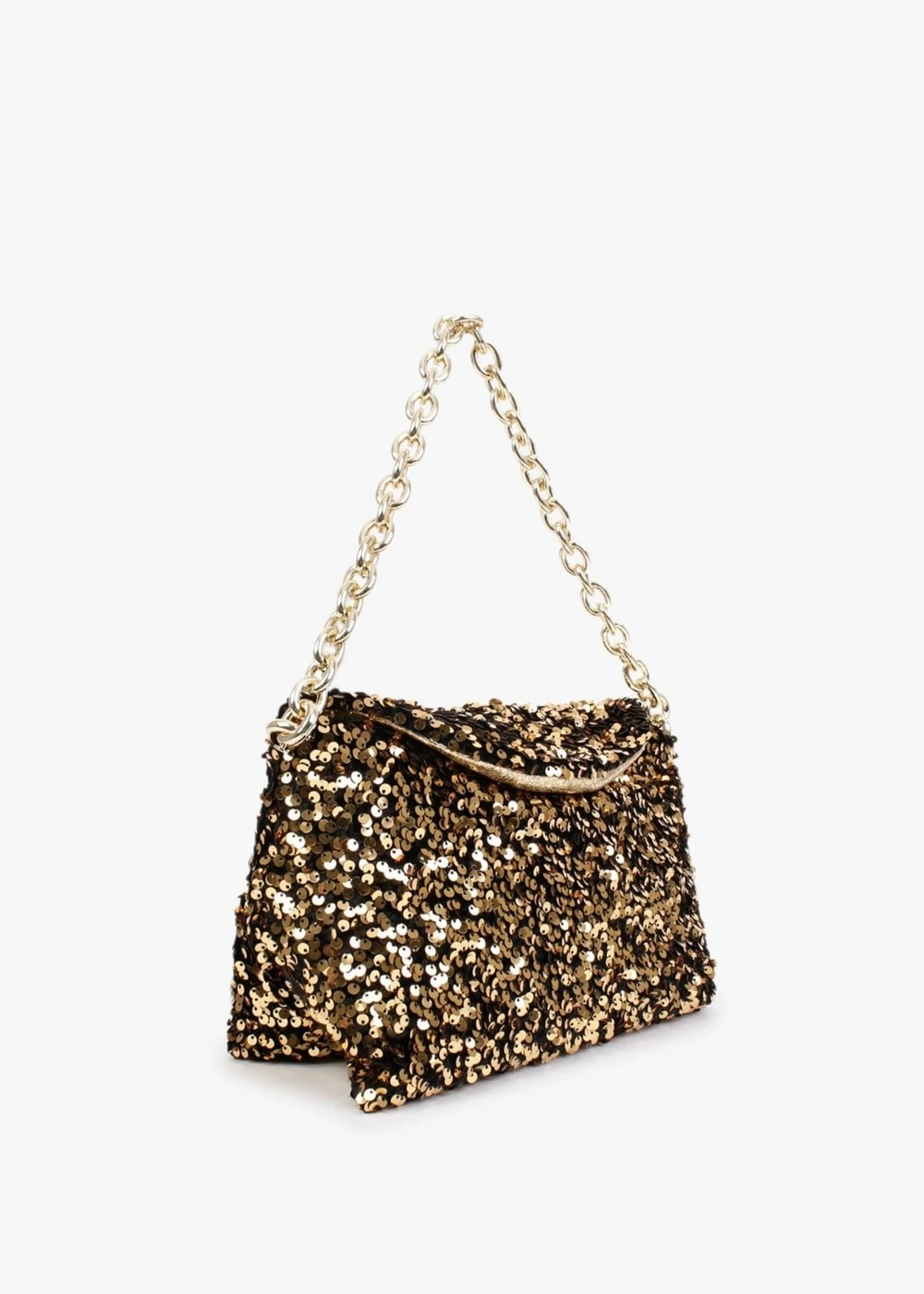 This glitzy style from Abro will be sure to get you noticed. A versatile New Season accessory crafted from a statement sequin outer with polished gold tone hardware and leather trim. The secure magnetic snap front flap reveals handy inner pockets. Carry by either of the detachable straps or use as a clutch. Signature Abro branding is seen to the inside of the bag.
