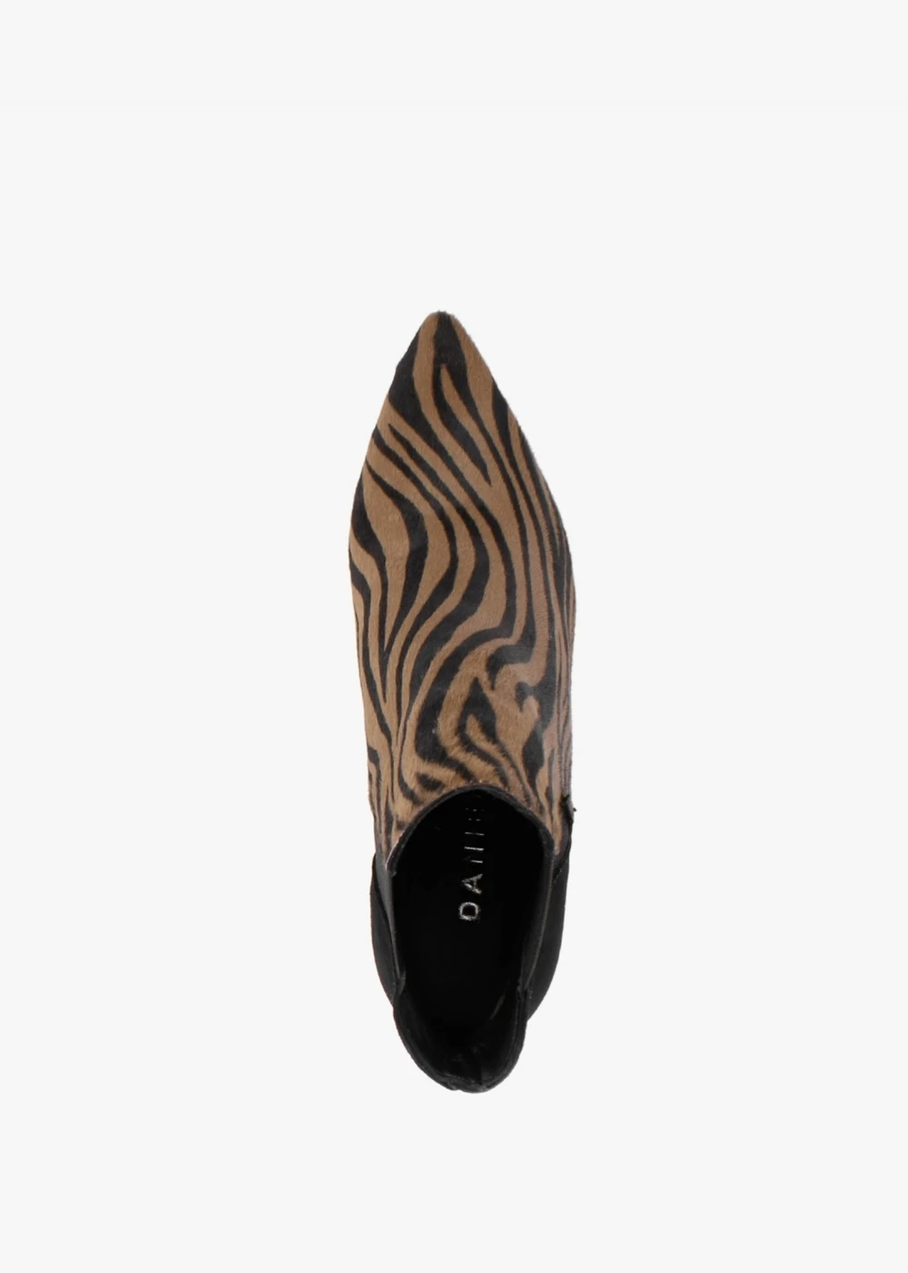 The ever popular ‘Adril’ ankle boot from Daniel Footwear is a true investment style. A simple yet chic silhouette influenced by pervious collections. As part of our most clicked range, this must have sort after style will seamlessly take you from day to dark. Crafted from a bold animal print calf hair and suede upper, luxurious leather lining and sole. Elasticated inserts add detail and make for an easy wear. The classic pointed toe and wrapped stiletto heel elevates this styles profile. Signature Daniel branding is seen to the foot-bed. Available in an assortment of colours.