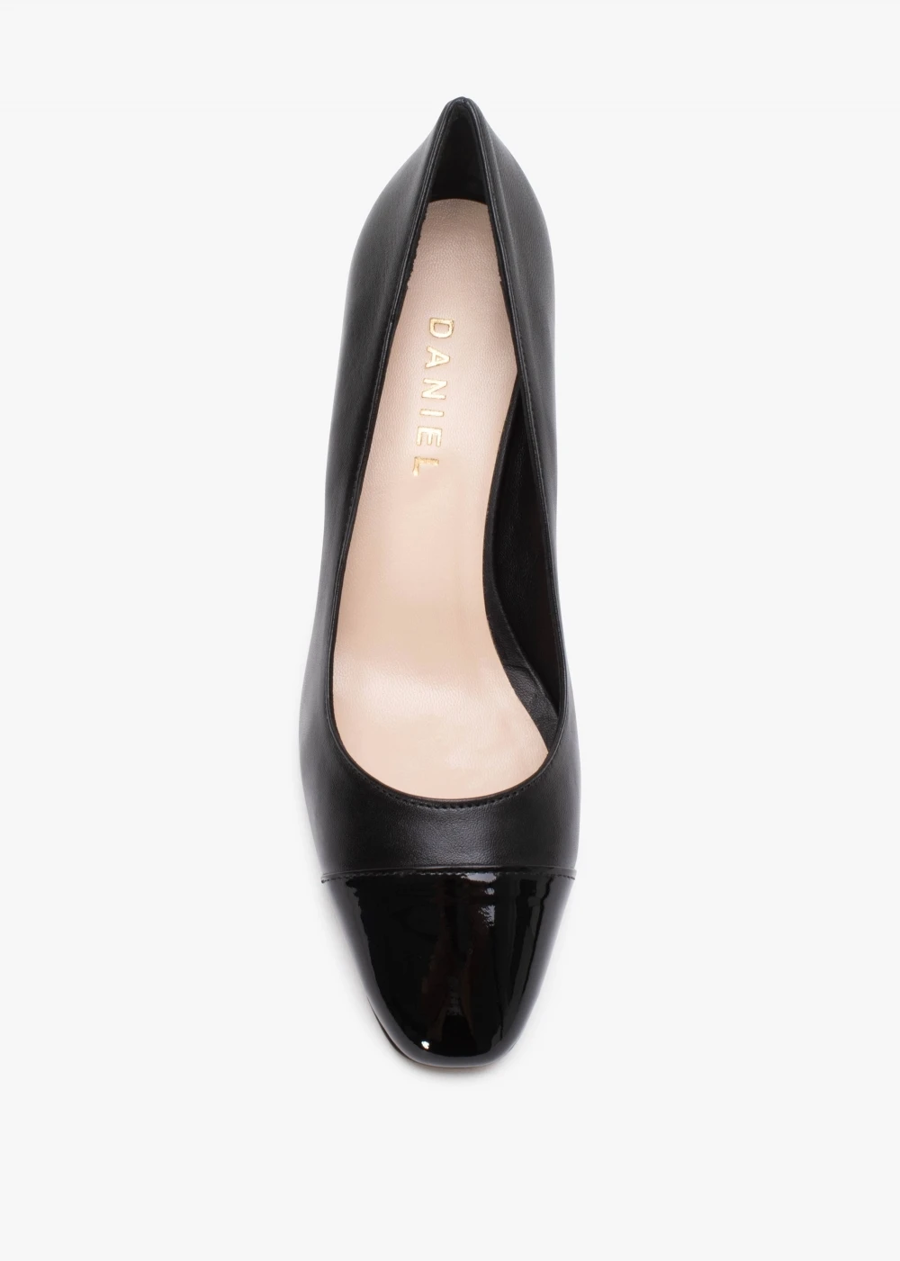 The āAkunaā court shoes are part of the New Season collection from Daniel Footwear. This timeless classic style will see you through Season after Season. Crafted from a premium leather upper with luxurious leather lining and sole. An easy to wear slip on style. A simple yet chic style featuring contrasting patent leather toe cap. The rounded toe and mid-block heel make up the silhouette. Signature Daniel branding is seen to the foot-bed.