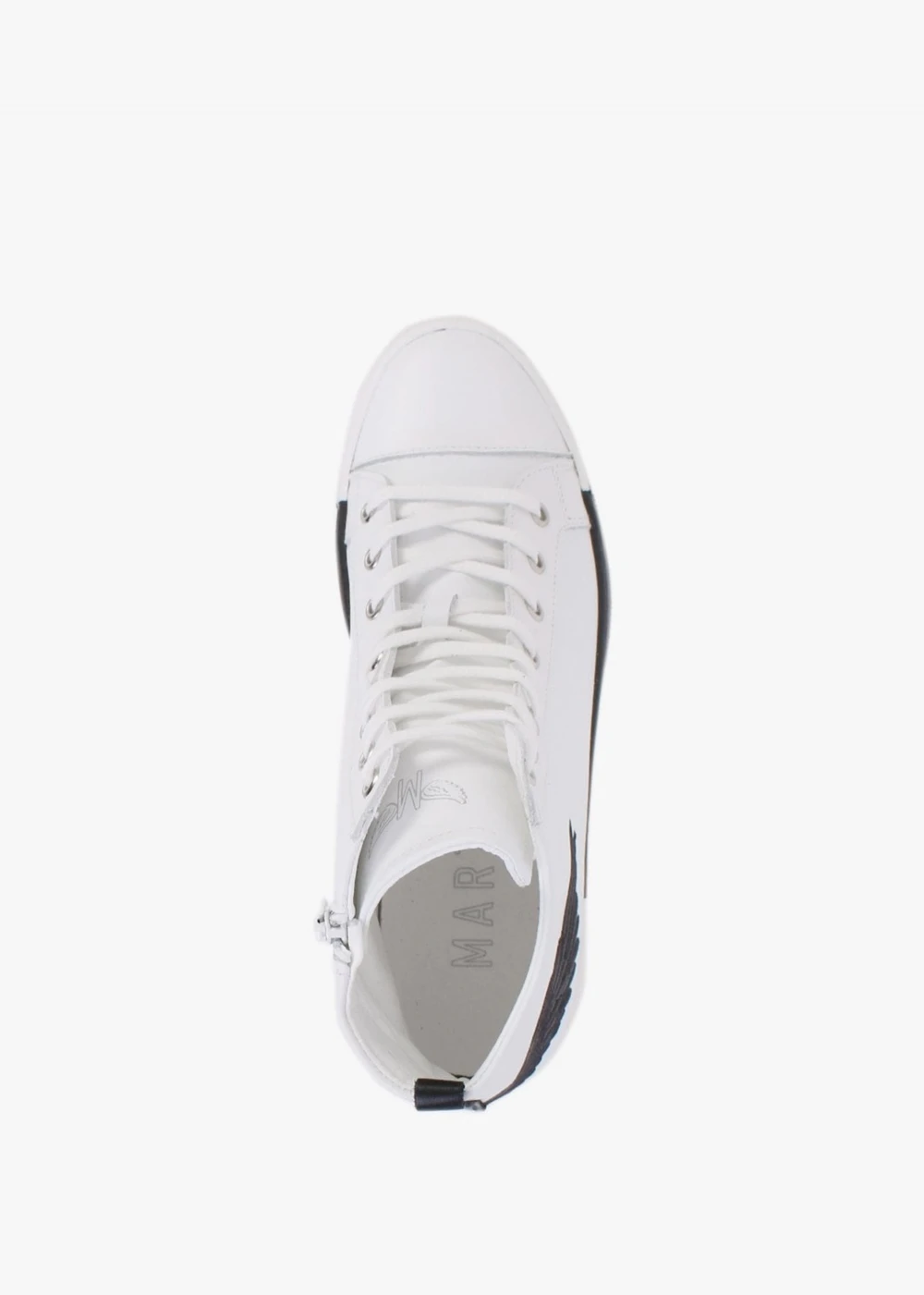 The ‘Angels High Top’ trainers are part of the New Season collection from Marté. This off-duty style is crafted from premium Italian soft nappa leather certified by the ‘Leather Working Group’ and features a comfy rubber sole. Zip fastening to the inner leg creates an easy wear and the lace system to the upper ensures the perfect fit. Embroidered black wing design adds detail as well as contrasting pull tab and classic logo to the tongue. Signature Marté branding is seen to the foot-bed.