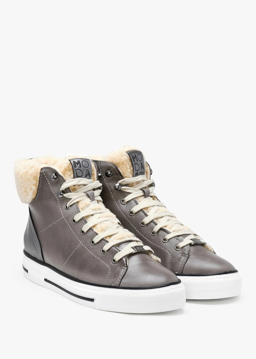 Add the ‘Anniia’ high top trainers from Moda In Pelle are the perfect off-duty style. Crafted from a premium leather upper with cosy faux fur lining and a comfy rubber sole. Zip fastening to the inner leg creates an easy wear and the lace up upper ensures the perfect fit. Tonal top stitching, raised seaming, tab to the top line and logo hardware add detail. Signature Moda In Pelle branding is seen throughout.