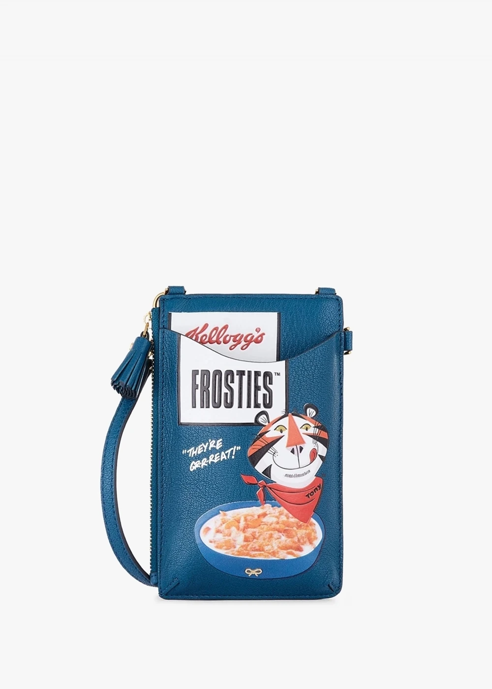 Carry your phone around in style is New Season with this “grrrrrreeeeaaat”! ‘Anya Brands Frosties’ phone case. This multifunctional whimsy style is crafted from premium shiny capra leather with gold tone hardware. A slim line silhouette featuring three compartments. Go hands free and carry by the detachable leather strap across the body. Iconic ‘Bow’ motif adds detail as well as signature Anya Hindmarch branding seen throughout.