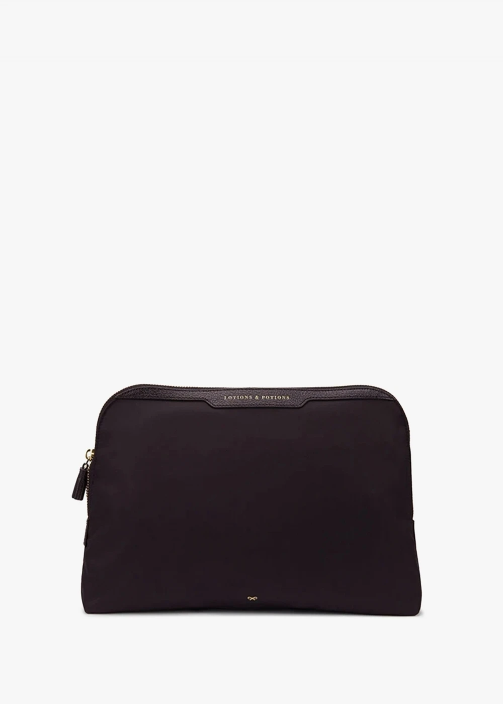 Inspired by Anya Hindmarch’s obsession with organization the ‘Lotions & Potions’ pouch is part of the New Season collection of accessories. Weather you’re at home or travelling somewhere this pouch is a must have. Crafted from premium ECONYL® regenerated nylon with luxurious capra leather trim and gold tone accents. The secure zip around fastening with tassel zip pull reveals the main compartment and features handy inner zip pocket. Iconic Anya Hindmarch ‘Bow’ adds detail. Signature Anya Hindmarch branding is seen throughout.