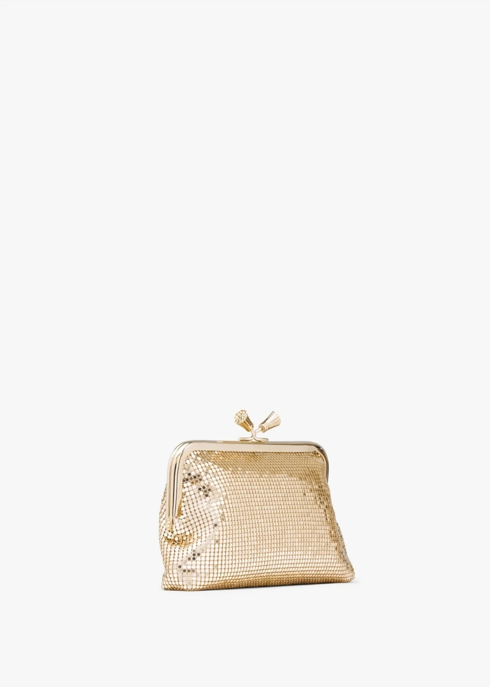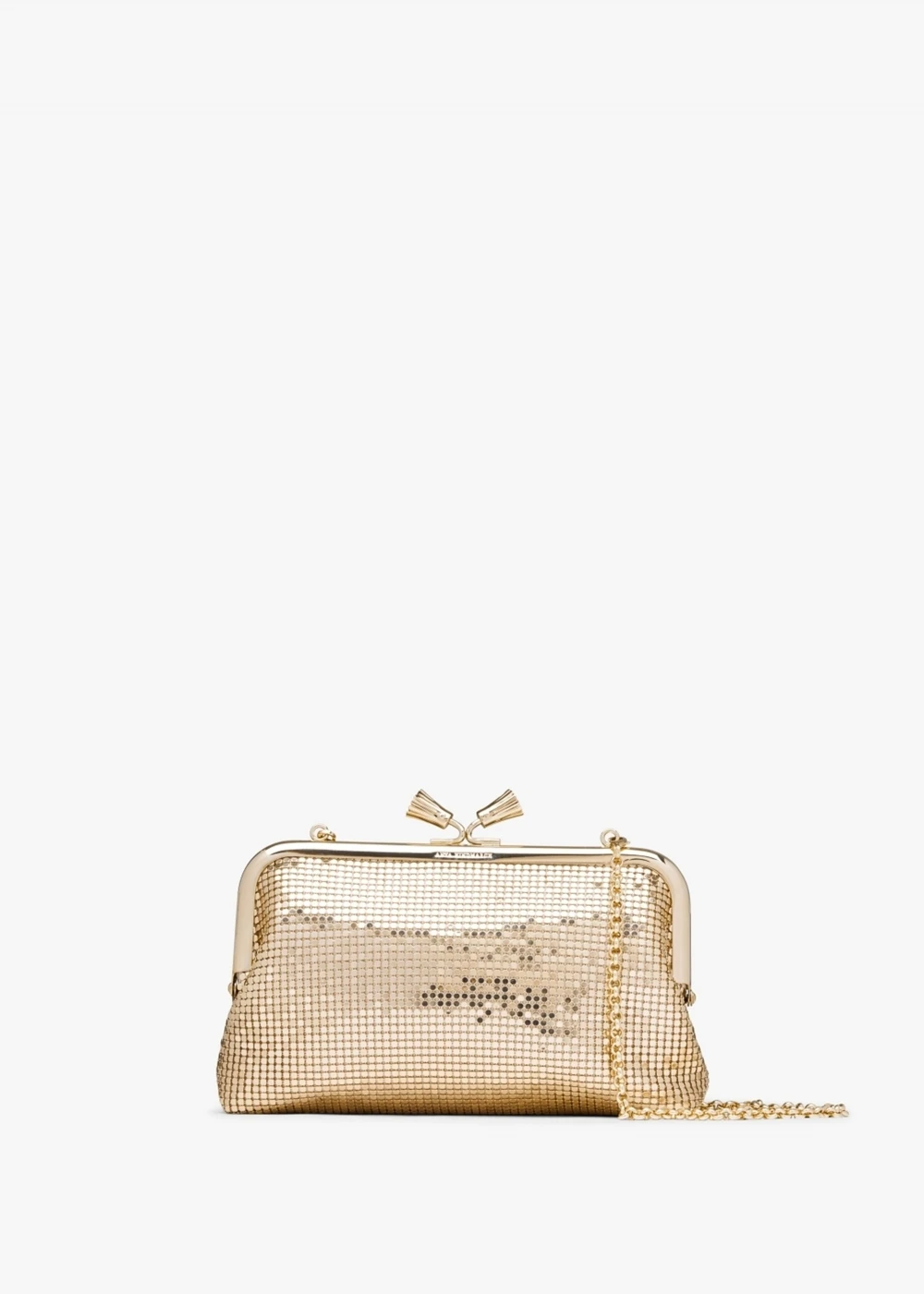 The ‘Mesh Maud Tassel’ clutch bag from Anya Hindmarch is the perfect occasion accessory. This effortlessly chic style is crafted from metal mesh with luxurious suede lining and gold tone accents. Classic purse fastening with vintage inspired frame and metal tassels feature. Carry by the delicate detachable chain strap or fashion as a classic clutch style. Classic logo is embossed on to the metal top frame. Signature Anya Branding is seen throughout.