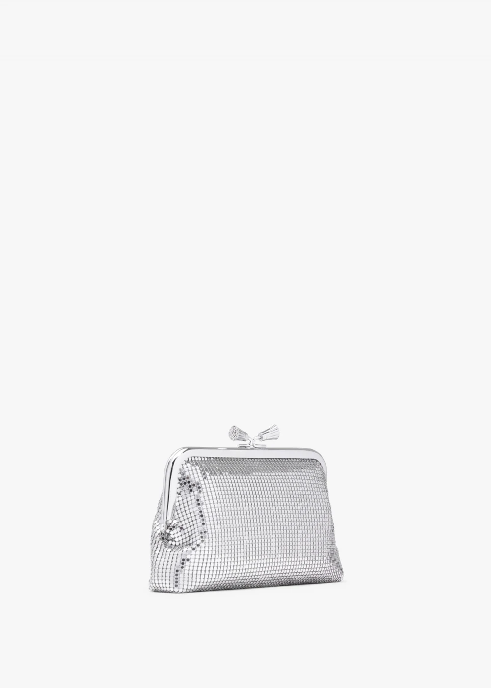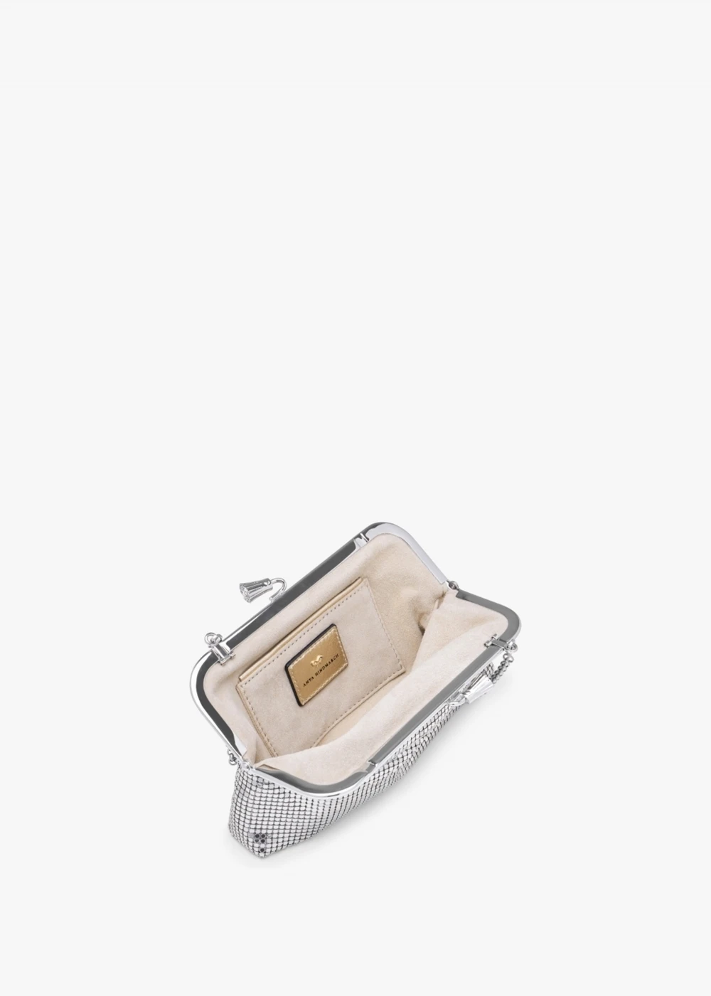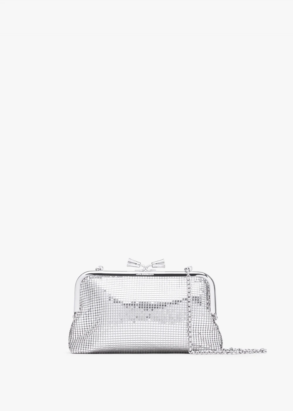 The ‘Mesh Maud Tassel’ clutch bag from Anya Hindmarch is the perfect occasion accessory. This effortlessly chic style is crafted from metal mesh with luxurious suede lining and silver tone accents. Classic purse fastening with vintage inspired frame and metal tassels feature. Carry by the delicate detachable chain strap or fashion as a classic clutch style. Classic logo is embossed on to the metal top frame. Signature Anya Branding is seen throughout.