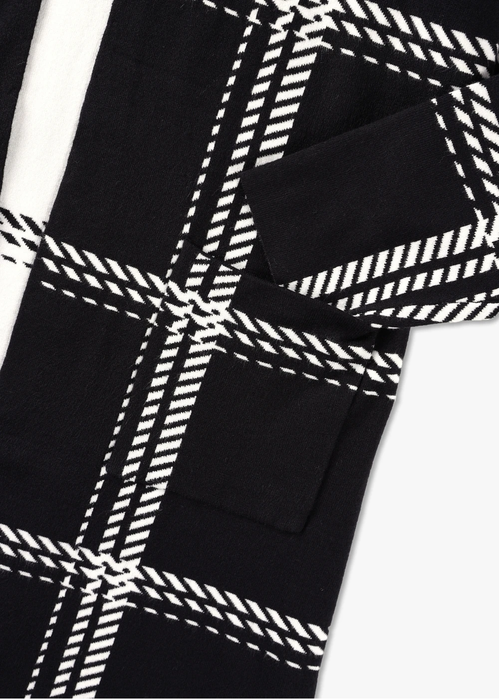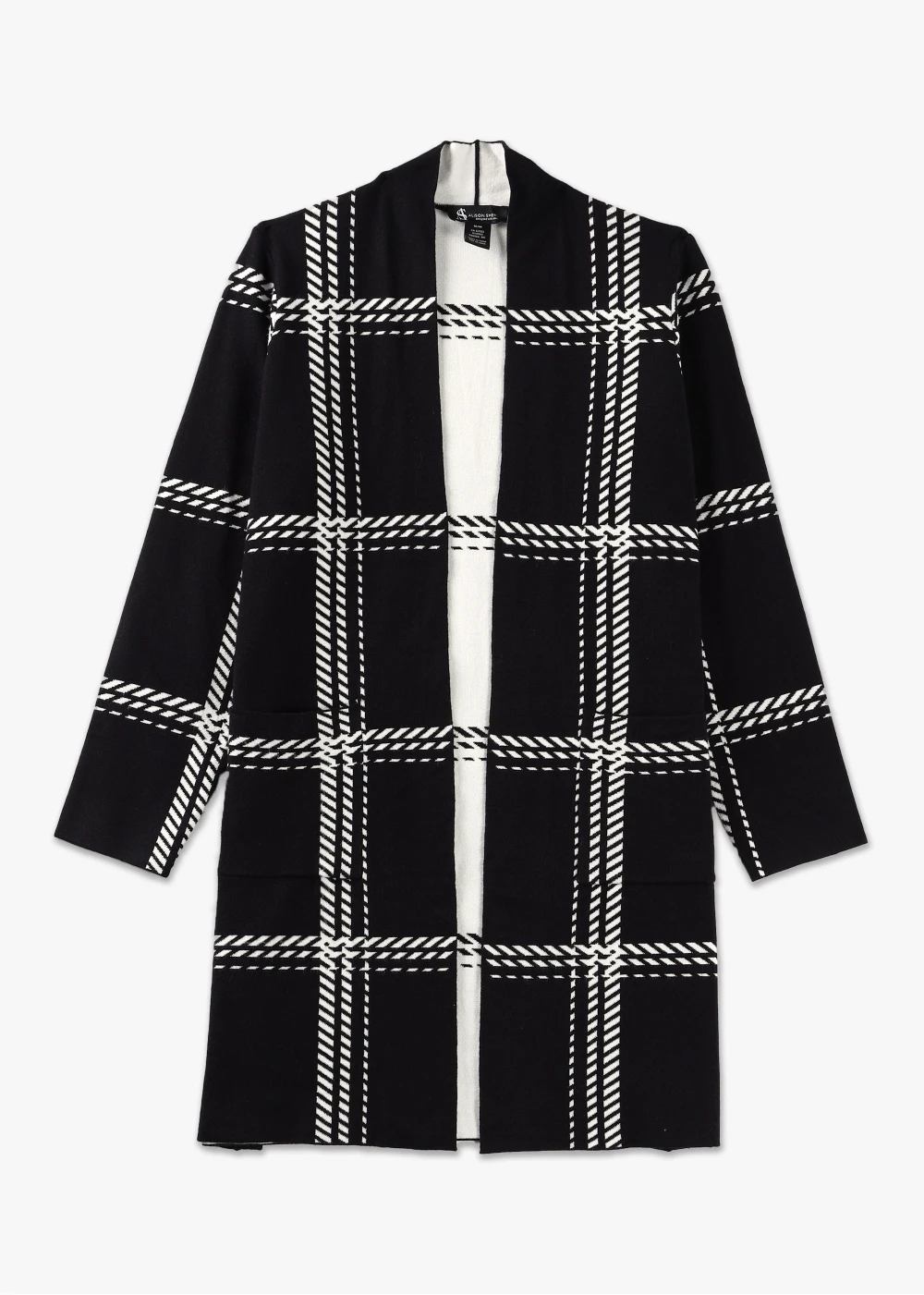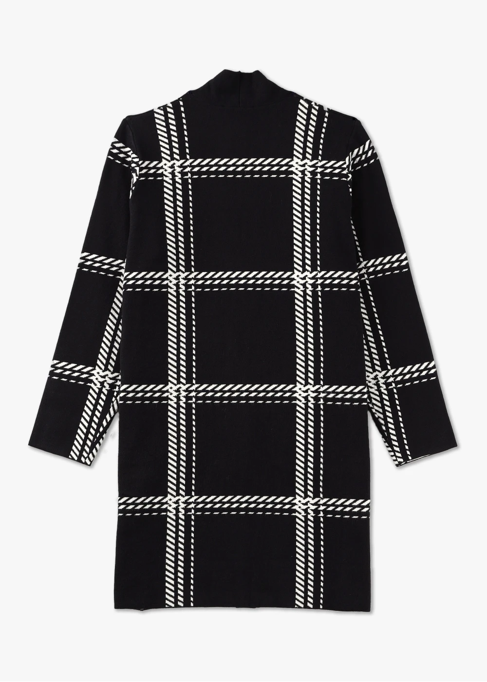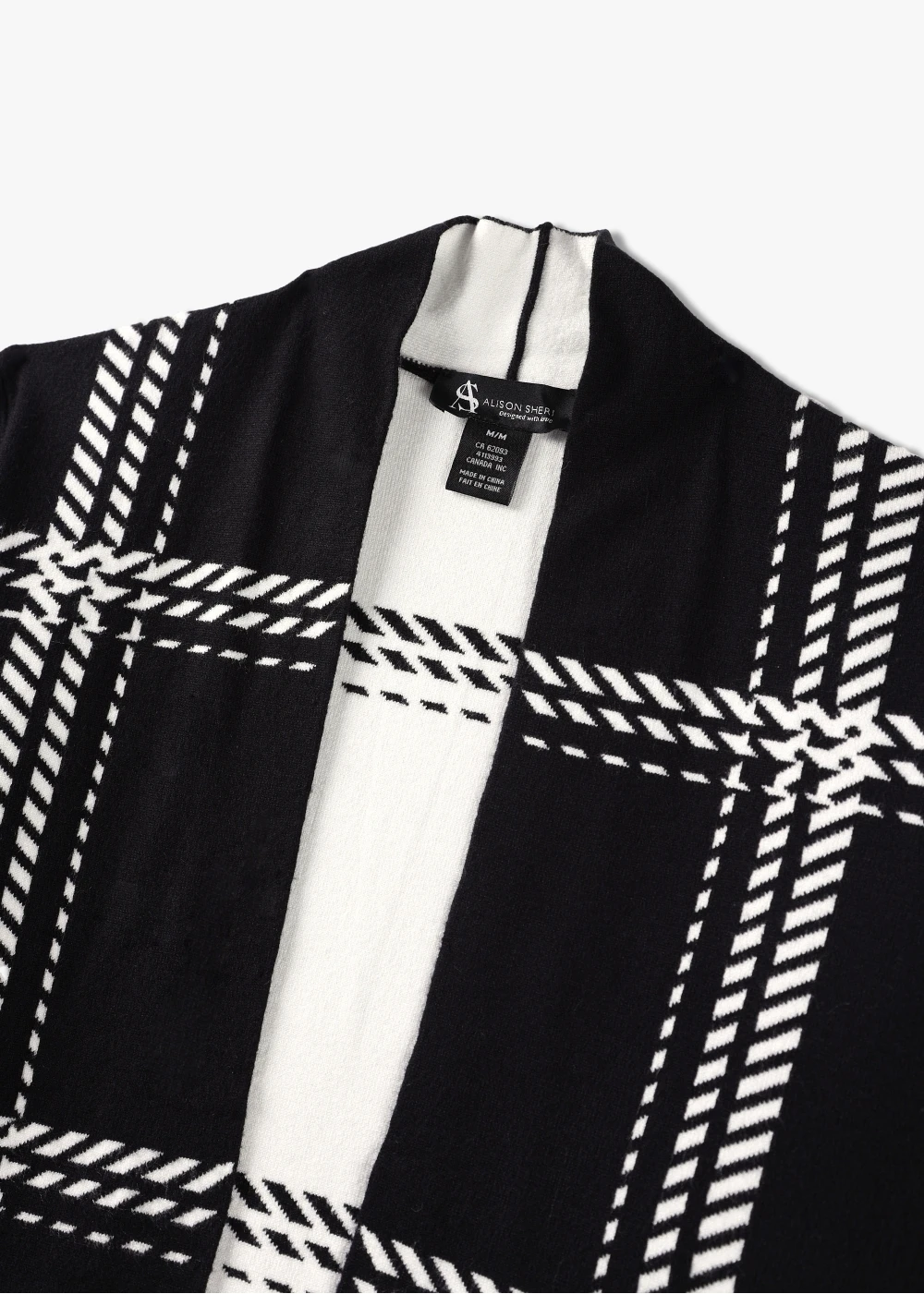 This New Season long-line cardigan from Alison Sheri is the perfect throw over. An easy to wear open style featuring bold monochrome design. Handy classic patch pockets add detail. Signature Alison Sheri branded tab is stitched into the back of the neck.