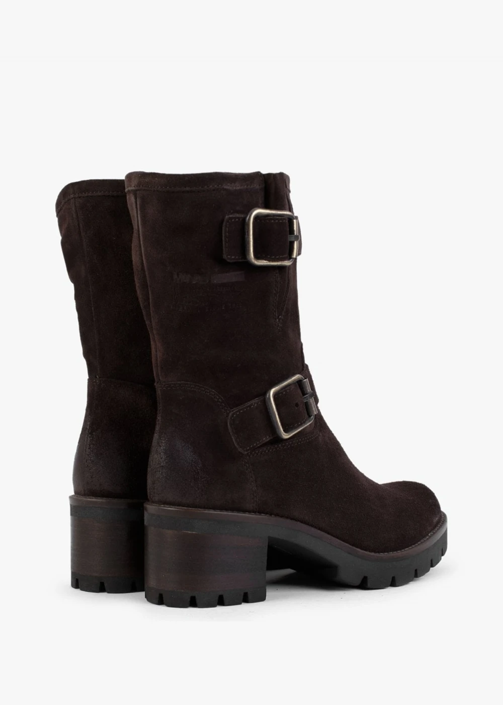 This New Season style from Manas is the perfect Winter boot. Crafted from premium suede with textile lining and a chunky rubber sole. Zip fastening to the inner leg creates an easy wear. Tonal top stitching, side vent and double buckle fastening add detail to the upper. The classic round toe and mid-block heel make up the silhouette. Signature Manas branding is seen to the foot-bed.