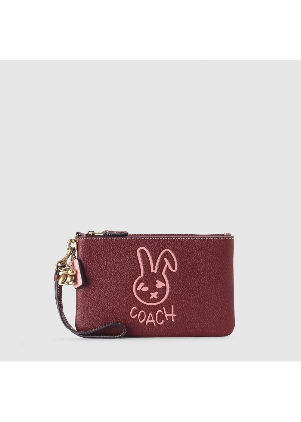 Celebrate 2023 Year of the Rabbit with COACH’s special Lunar New Year collection. This must have style is crafted from polished pebbled leather with gold tone accents. The secure top zip fastening reveals the main compartment with handy inner slot pockets. Carry by the wristlet strap. Whimsical rabbit charm adds detail as well as embossed motif to the front of the pouch. Signature COACH branding is seen throughout.