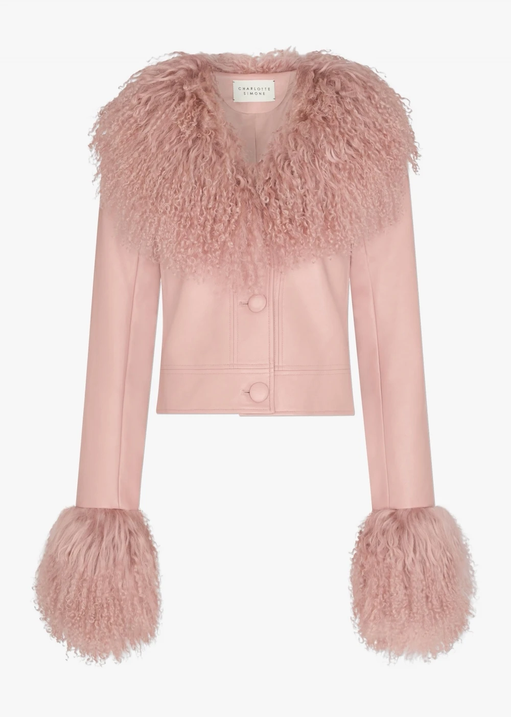 Add some 70’s inspired glamour to your Winter wardrobe with the cropped ‘Penny’ jacket from Charlotte Simone. This New Season day to night style is crafted from premium faux leather with luxurious Mongolian lambswool trim. The centre front button fastening creates an easy wear. Signature Charlotte Simone branding is seen to the lining.