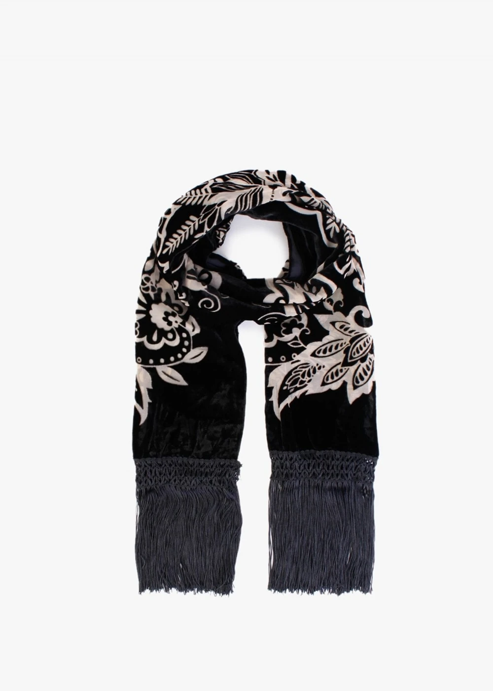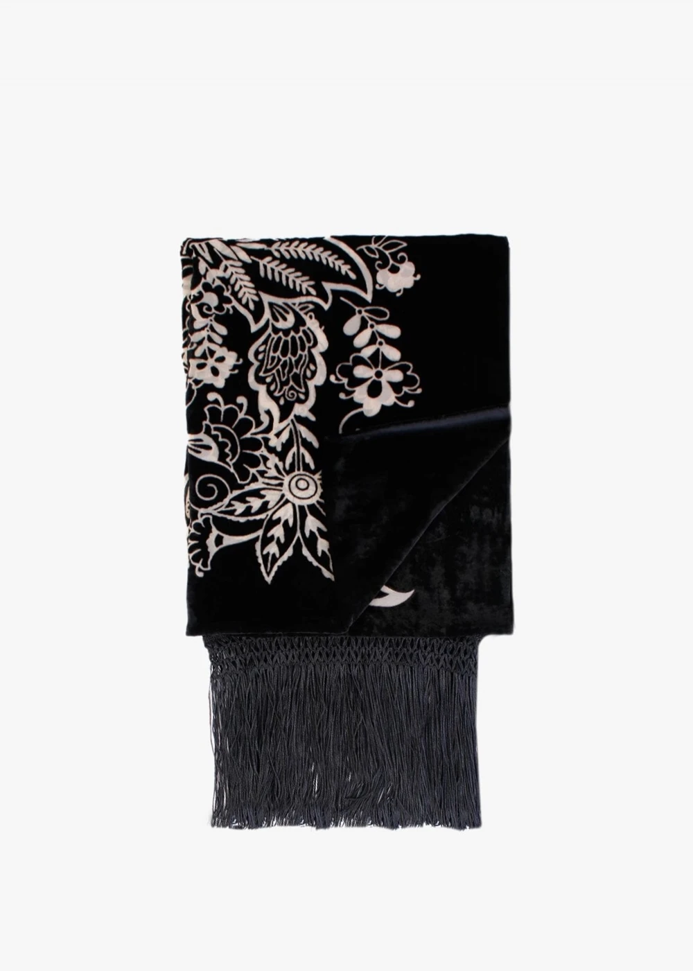 This ‘Devore’ style scarf is part of the New Season collection from Daniel. A day to night accessory crafted from velvet look fabric featuring floral burn out design and tassel trim. Signature Daniel branding is stitched into the hem.