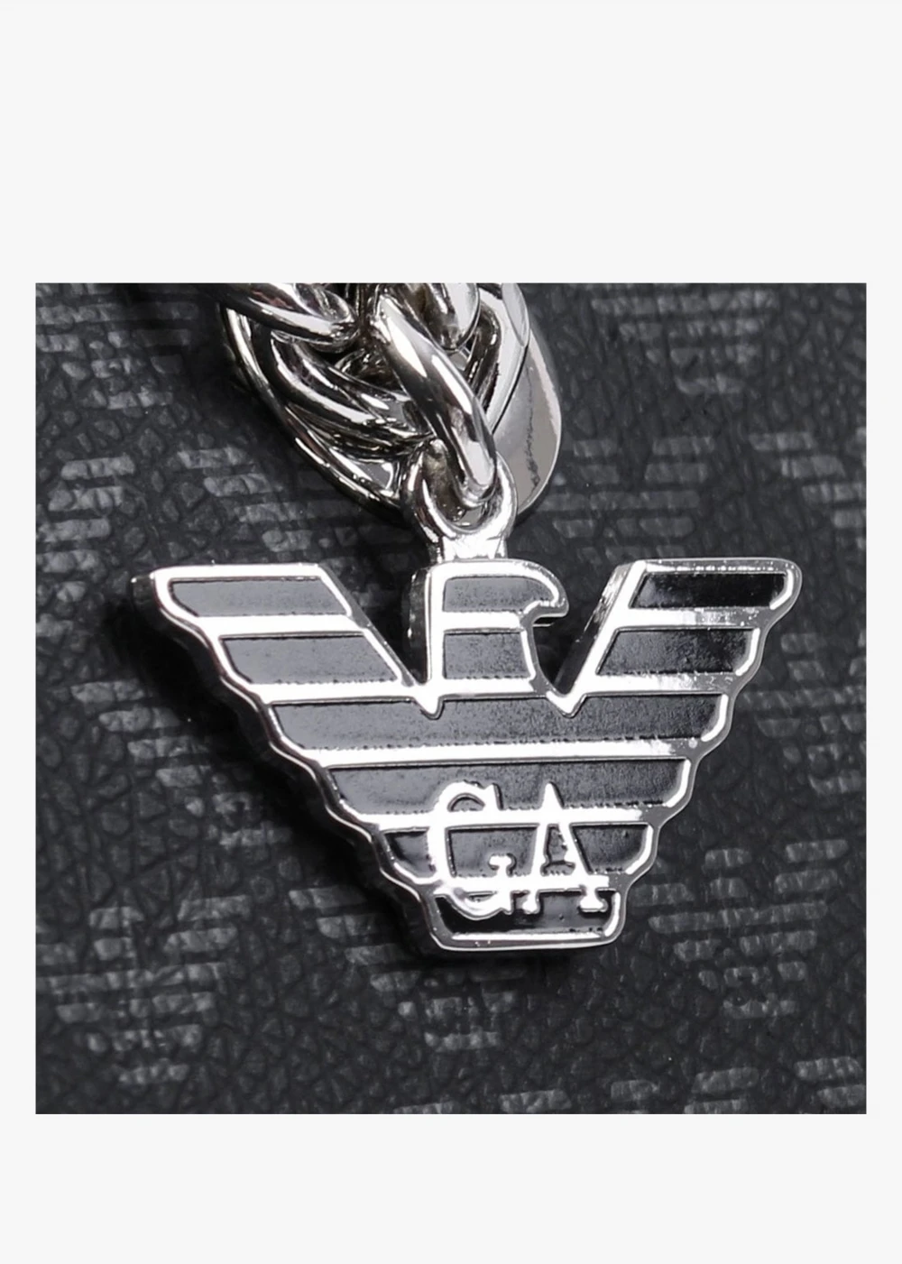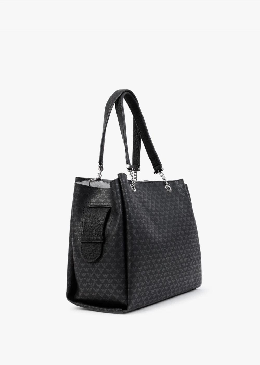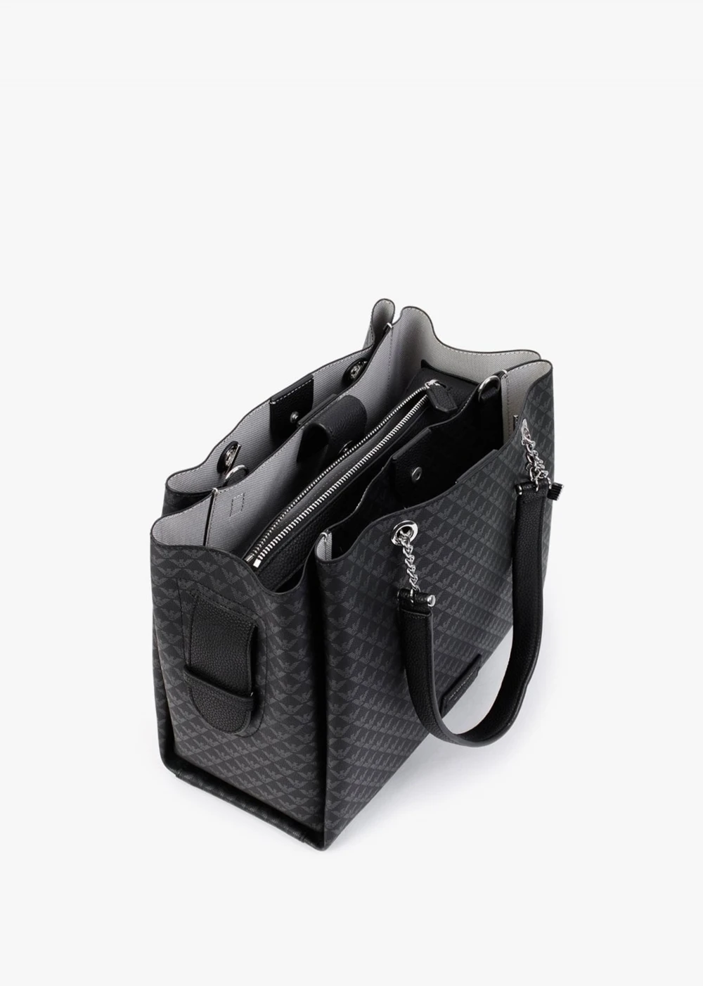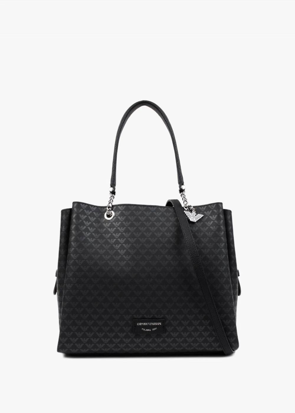 Add this New Season everyday bag from Emporio Armani to your bag collection. This spacious style is crafted from premium PU in a repeat logo design with silver tone hardware. Secure zip and popper fastenings reveal multiple handy compartments. Carry by the grab handles or the detachable strap. Classic bag charm adds detail. Signature Emporio Armani branding is seen throughout.