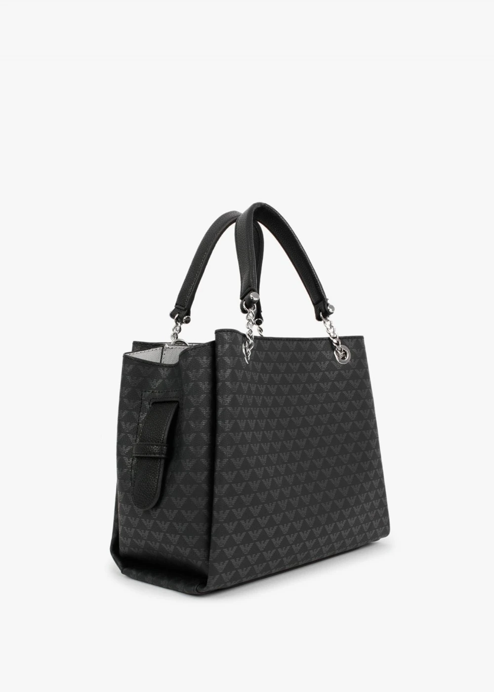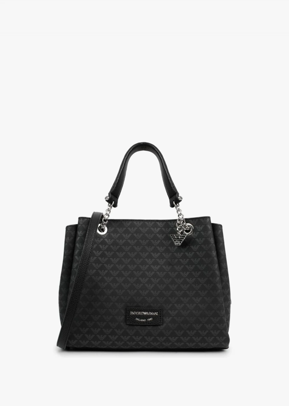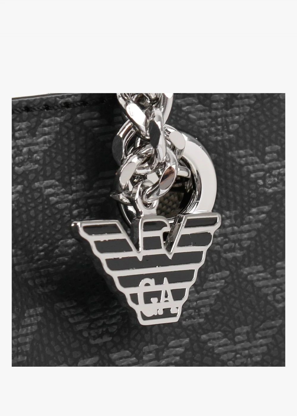 Add the ‘Eagle’ tote bag from Emporio Amani to your handbag collection. This New Season versatile style is crafted from premium PU in a repeat logo design with polished silver tone hardware. The secure magnetic snap fastenings reveal multiple compartments. Detachable logo pouch features to the inside of the bag. Carry by the grab handles to the detachable strap. Classic eagle bag charm adds detail. Signature Emporio Armani branding is seen throughout.