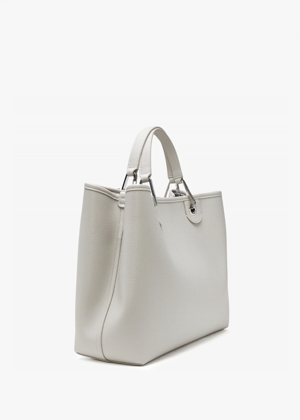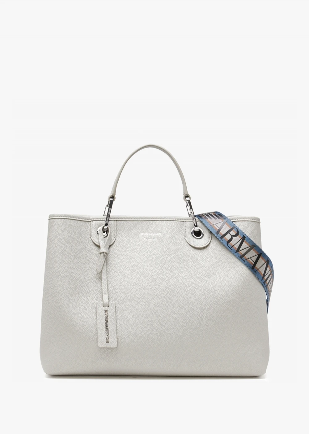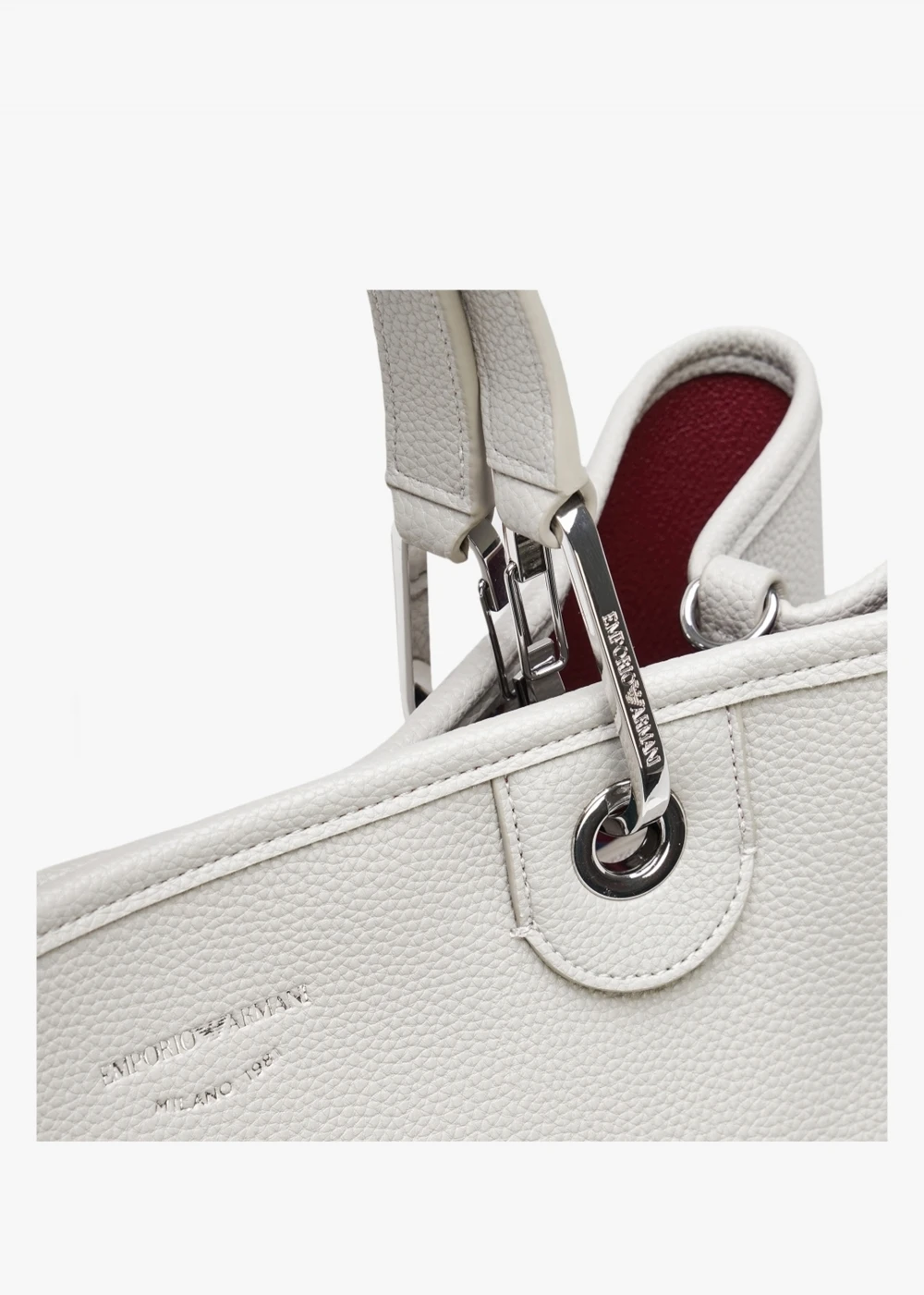 This ‘Shopper With Pouch’ from Emporio Armani is the perfect day bag style. Crafted from premium pebbled PU with silver tone accents. The secure magnetic snap fastening reveals the main compartment with handy inner detachable pouch. Carry by the top handles or go hands free with the detachable logo guitar strap. Signature Emporio Armani branding is seen throughout.