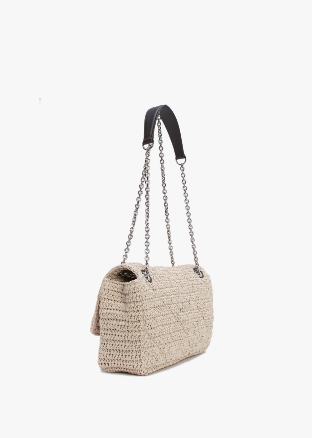 The ‘Noelle’ cross-body bag from Emporio Armani is the perfect Summer accessory. This New Season bag is crafted from a natural woven straw like outer with canvas lining and polished silver tone hardware. The secure push lock fastening reveals the main compartment featuring handy inner slot pocket. Carry by the adjustable chain and PU strap. Signature Emporio Armani branding is seen throughout.