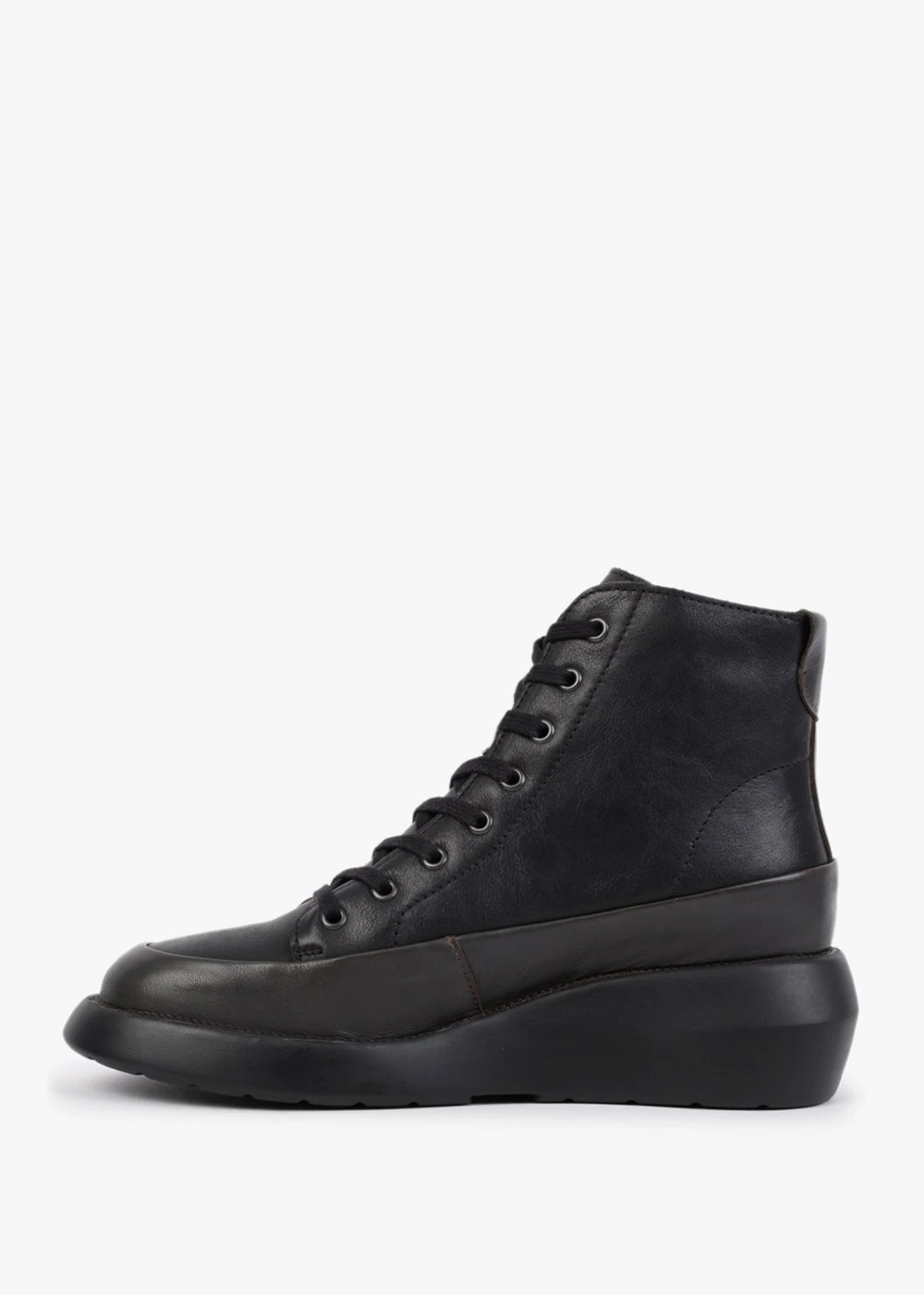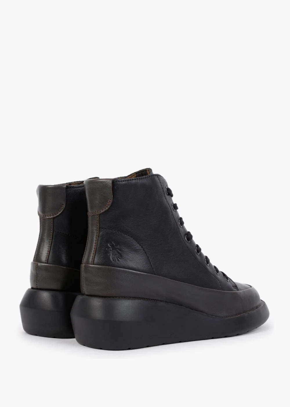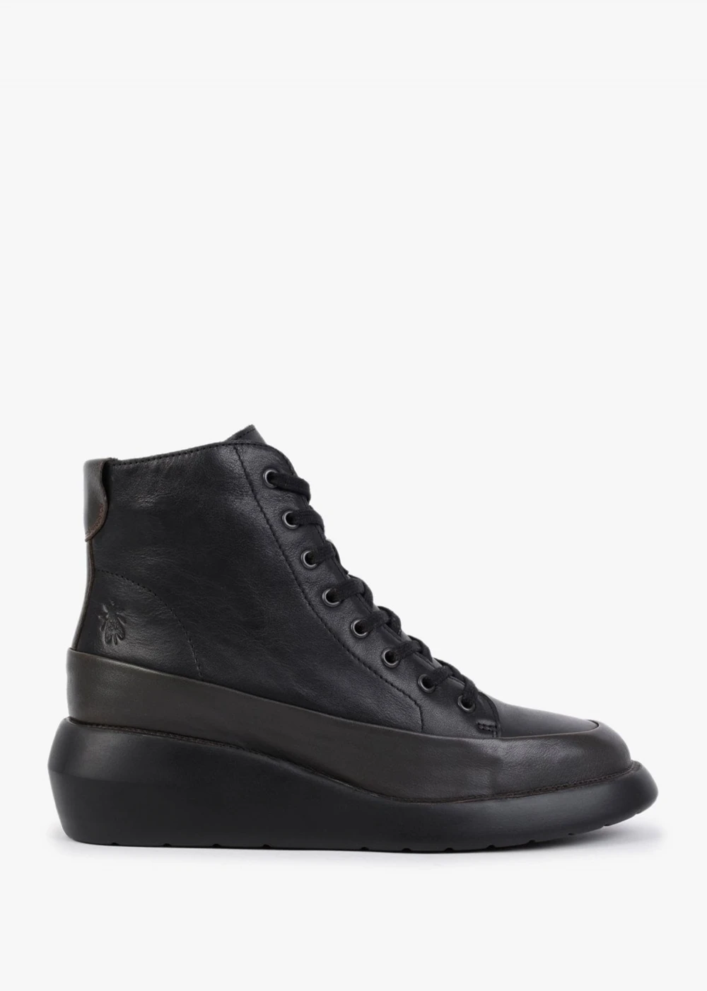 Add the ‘Boze’ wedge ankle boots from Fly London to your boot collection. This New Season style is crafted from a premium leather upper with textile lining and a comfy rubber sole. The lace up upper ensures the perfect fit. Classic round toe and low wedge heel make up the silhouette. Subtle top stitching, raised seaming and classic embossed ‘Fly’ logo add detail. Signature Fly London branding is seen to the foot-bed and sole.