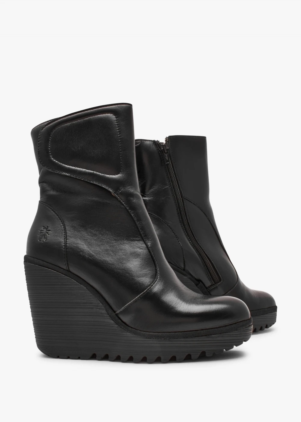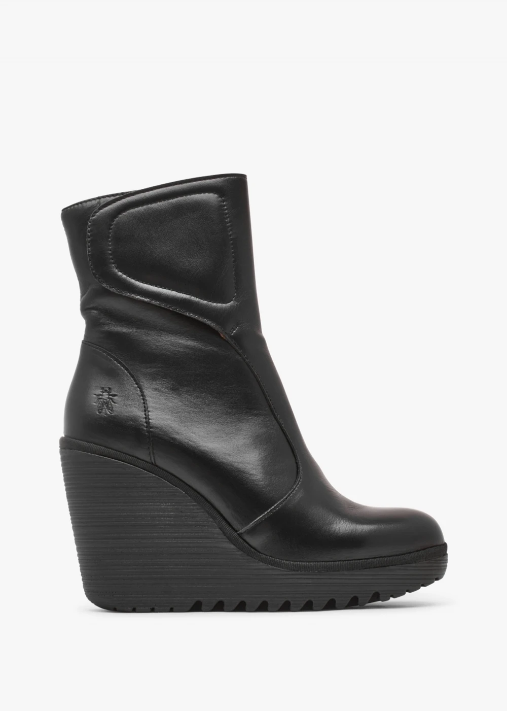 The ‘Dally’ high wedge ankle boots are part of the New Season style from Fly London. This re-invented classic style is crafted from premium shiny leather with patterned microfiber lining and a saw edge rubber sole. Zip fastening to the inner leg creates an easy wear as well as velcro fastening top-line. Subtle tonal top stitching and raised seaming add detail as well as classic embossed ‘Fly’ logo. The round toe and high wedge make up the silhouette. Signature Fly London branding is seen to the foot-bed and sole.