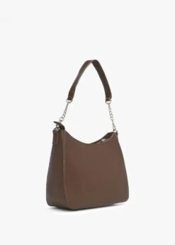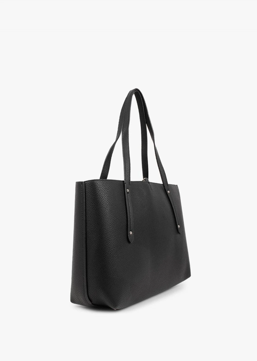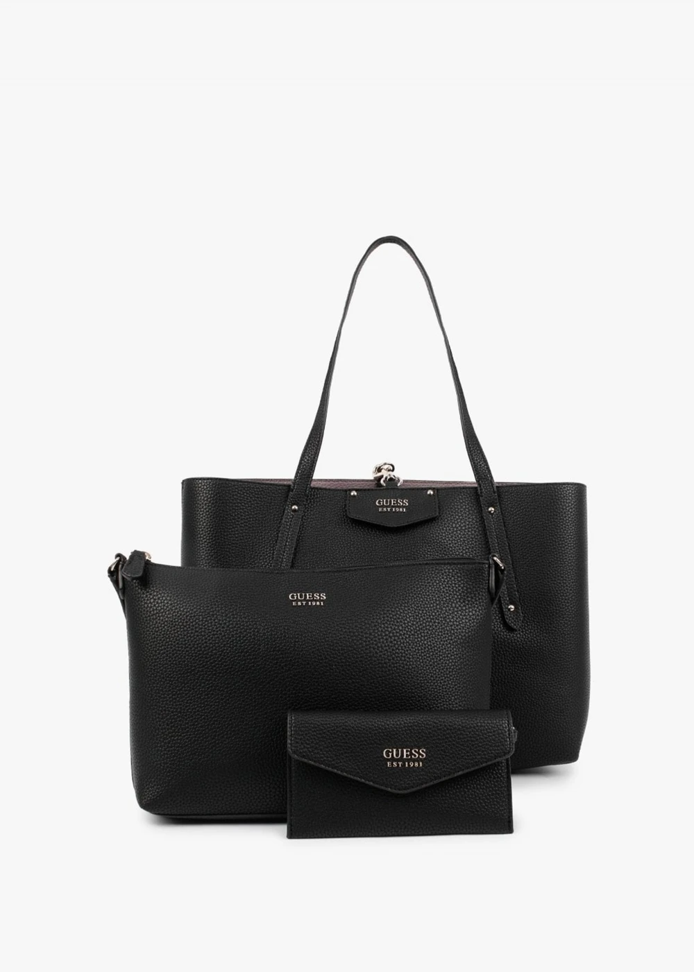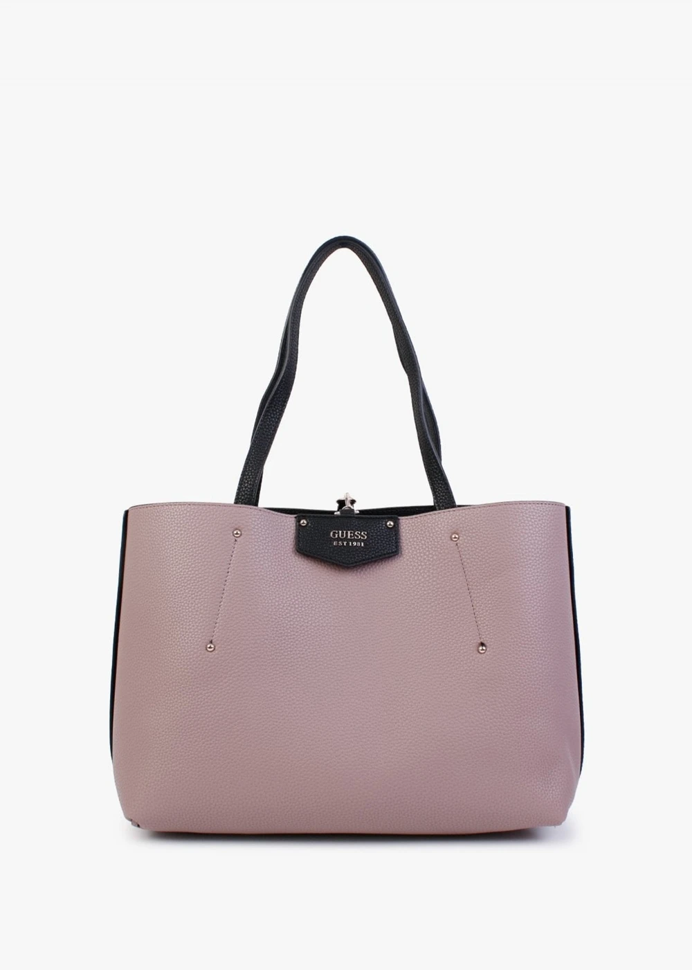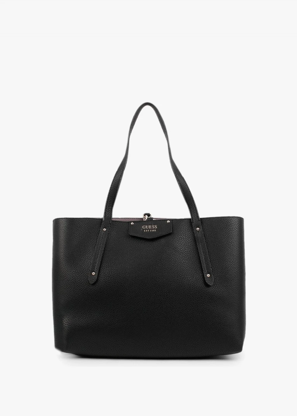 The ‘Eco Brenton Reversible’ tote bag is part of the New Season collection from GUESS. This everyday day style is crafted from 100% recycled PU with polished gold tone hardware. The secure lobster clasp top fastening reveals the spacious main compartment featuring handy removable shoulder pouch. Detachable small pouch also adds detail, perfect for smaller items. This versatile reversable tote means you can coordinate with multiple outfits. Signature GUESS branding is seen throughout.