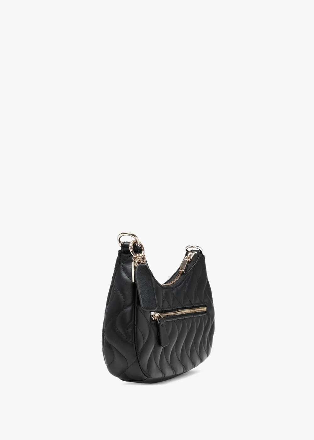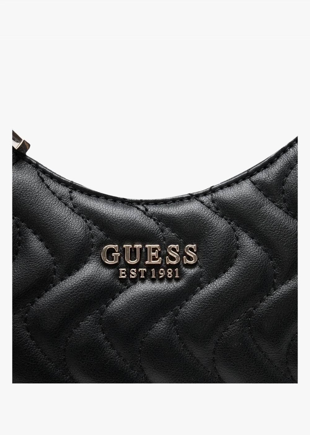 Add the ‘Eco Mai’ cross-body bag from GUESS to your handbag collection. This everyday style is crafted from premium PU that contains recycled plastic in a classic quilted design with polished gold tone hardware. The secure top zip fastening reveals the logo lined main compartment featuring handy inner zip and slot pockets, exterior zip pocket also features. Carry by the detachable strap. Classic bag charms add detail. Signature GUESS branding is seen throughout.