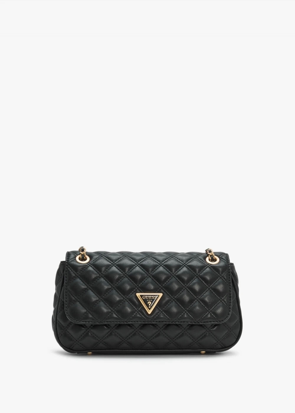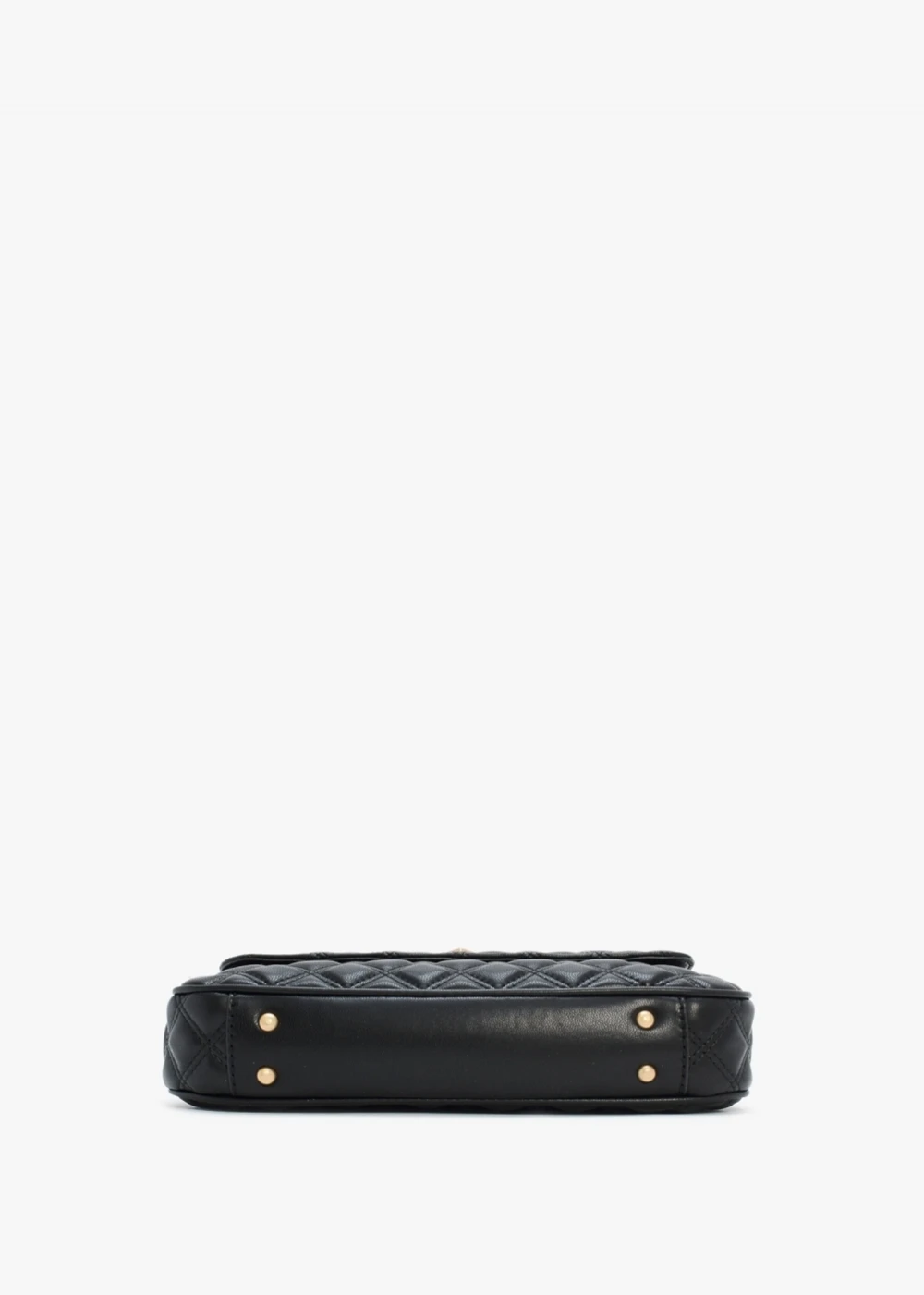 The ‘Giully’ cross-body bag from GUESS is a timeless classic style that will see you through Season after Season. This day to night bag is crafted from premium PU in a quilted design with brushed gold tone accents. The secure magnetic snap front flap reveals logo lining as well as handy inner zip and slot pockets. Logo disc bag charm adds detail. Carry by the adjustable chain and PU straps on shoulder or across the body. Signature GUESS branding is seen throughout.