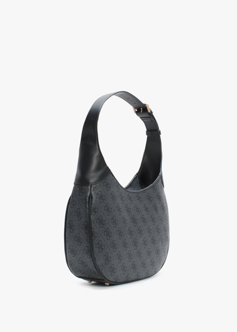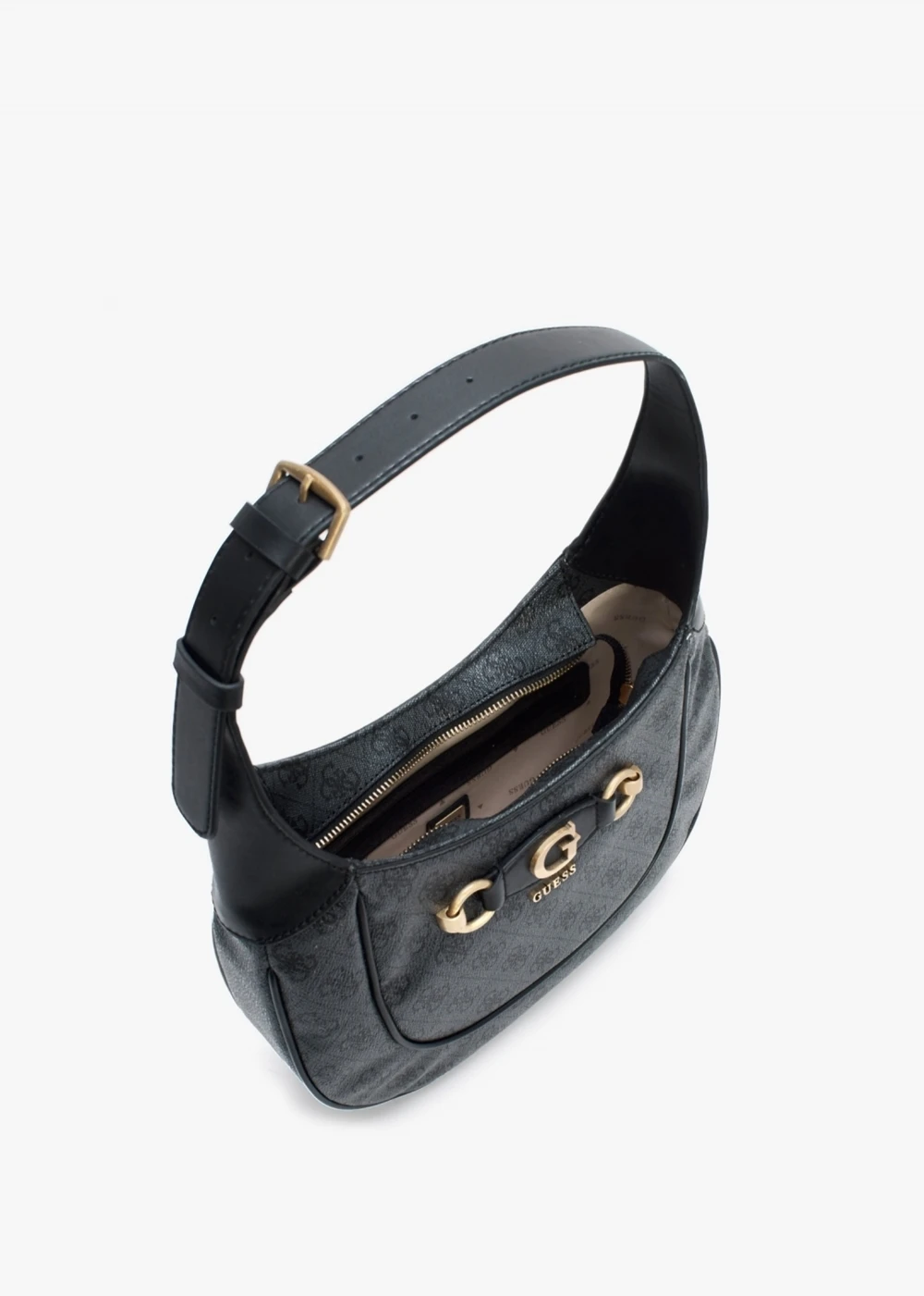 The ‘Izzy’ hobo bag is part of the New Season collection from GUESS. This everyday style is crafted from premium textured PU in a repeat logo design with brushed gold tone hardware. The secure top zip fastening reveals logo lining and handy inner zip & slot pocket. Carry by the adjustable shoulder strap. Horse bit hardware adds detail as well as classic G logo. Signature GUESS branding is seen throughout.