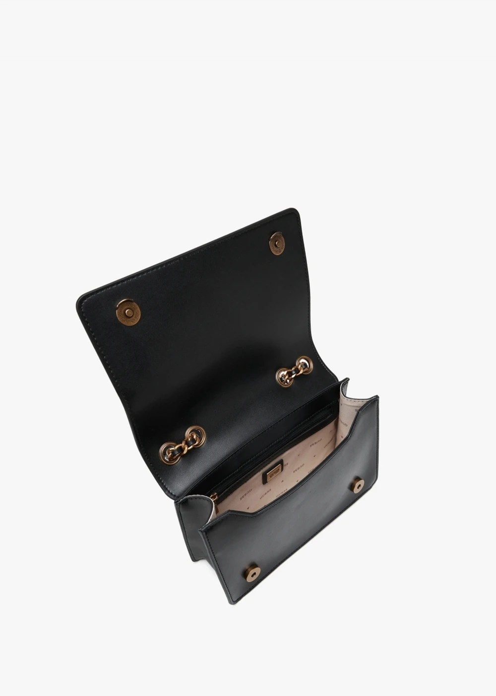 Add the ‘Izzy Convertible’ cross-body bag from GUESS to your handbag collection. This New Season style is crafted from preamium PU featuring brushed gold tone hardware. The secure magnetic snap front flap reveals logo lining with handy inner zip and slot pockets, exterior zip pocket also features. Horse bit hardware adds detail as well as classic G logo. Carry by the adjustable chain and PU strap. Signature GUESS branding is seen throughout.