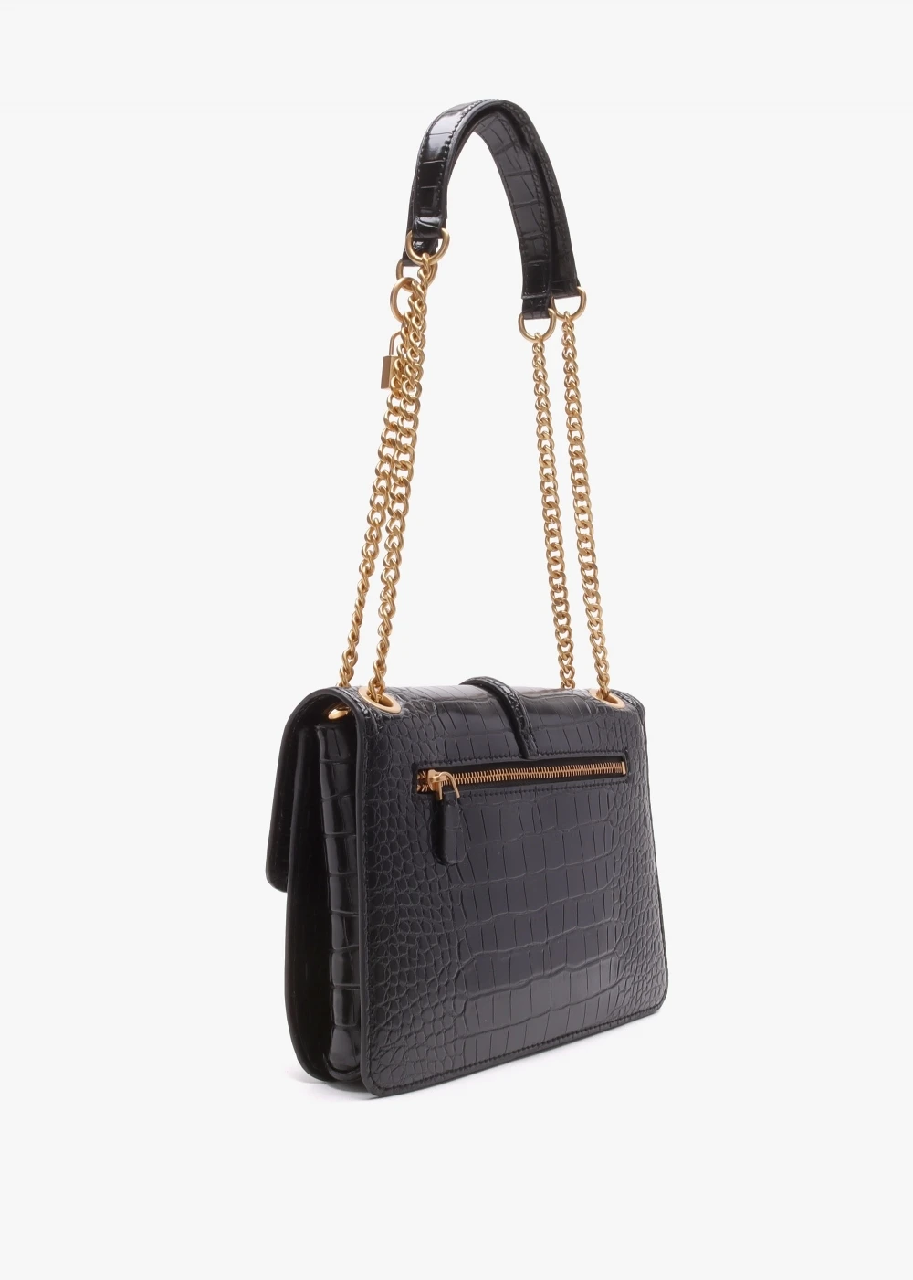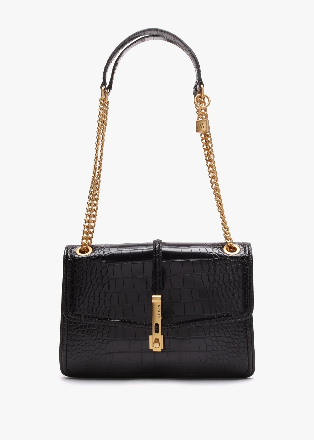 Add the ‘James’ cross-body bag from GUESS to your handbag collection. This luxurious New Season style is crafted from premium PU in a chic moc croc design with brushed gold tone hardware. The secure twist lock front flap fastening reveals logo lining and handy inner slot pockets, exterior zip pocket also features. Carry by the chunky curb chain & PU strap on the shoulder or across the body. Detachable padlock charm adds detail. Signature GUESS branding is seen throughout.