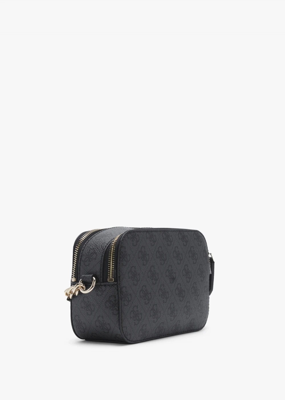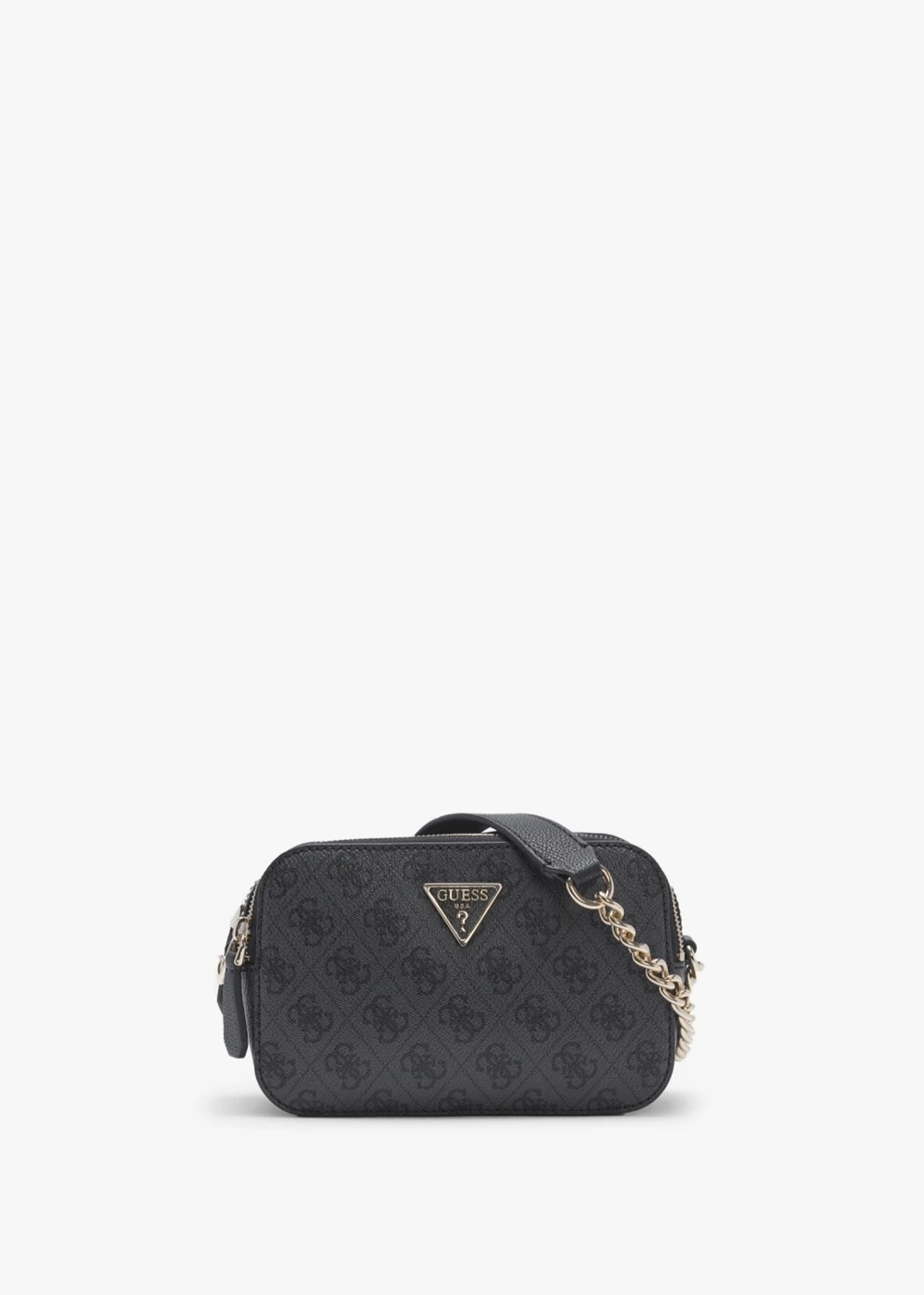 Add the ‘Noelle’ cross-body bag from GUESS to your handbag collection. This New Season style is crafted from premium textured PU in a repeat logo design with polished gold tone accents. The secure zip fastening double compartment reveals logo lining and handy inner zip and slot pockets. Carry by the chunky curb chain and PU strap. Signature GUESS branding is seen throughout.