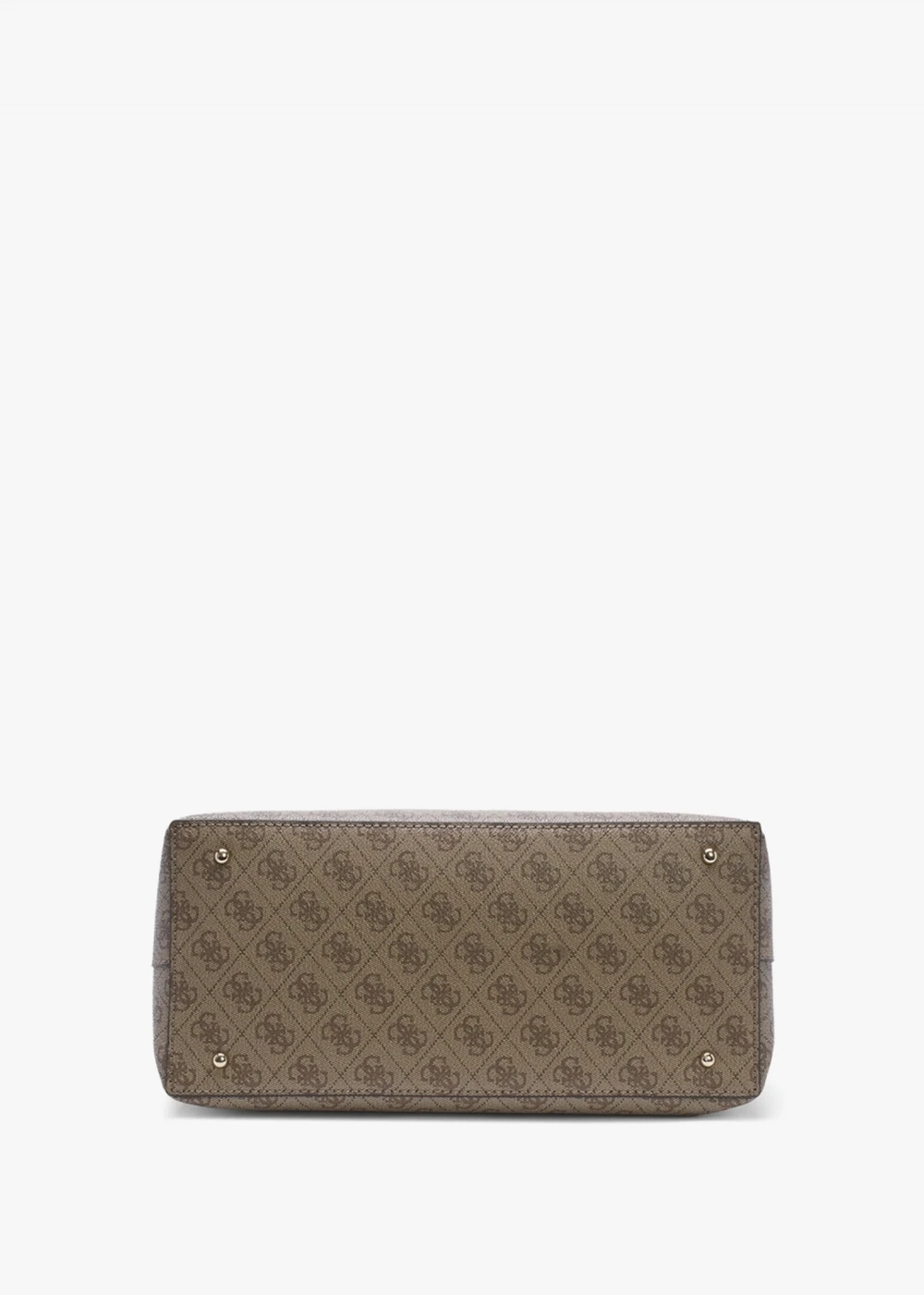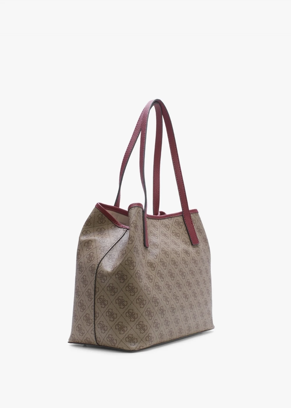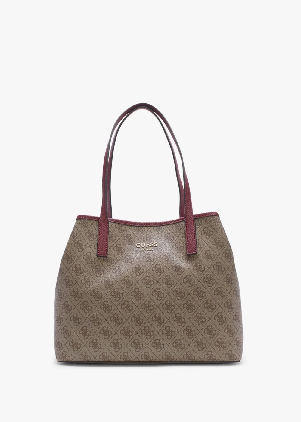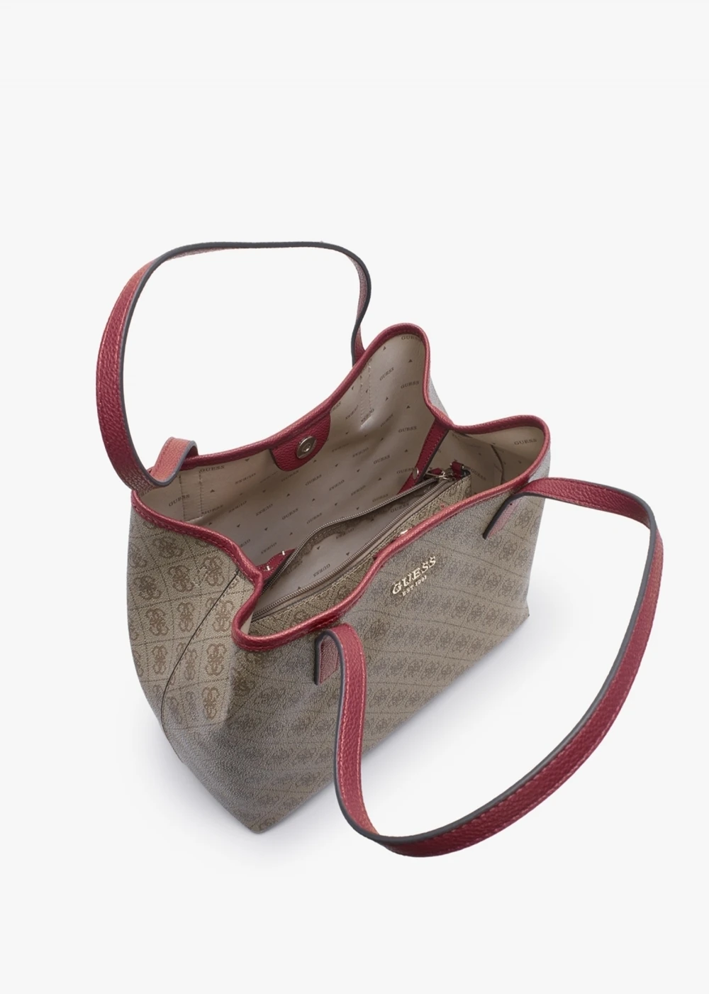 Be seen this New Season with the ‘Vikky’ tote bag from GUESS. This classic style will see you through Season after Season. Crafted from premium textured PU in a repeat logo design with polished gold tone accents. Secure magnetic snap fastening reveals a spacious main logo lined compartment featuring handy detachable pouch. Contrasting red trim adds detail. Carry by the top handles. Signature GUESS branding is seen throughout.