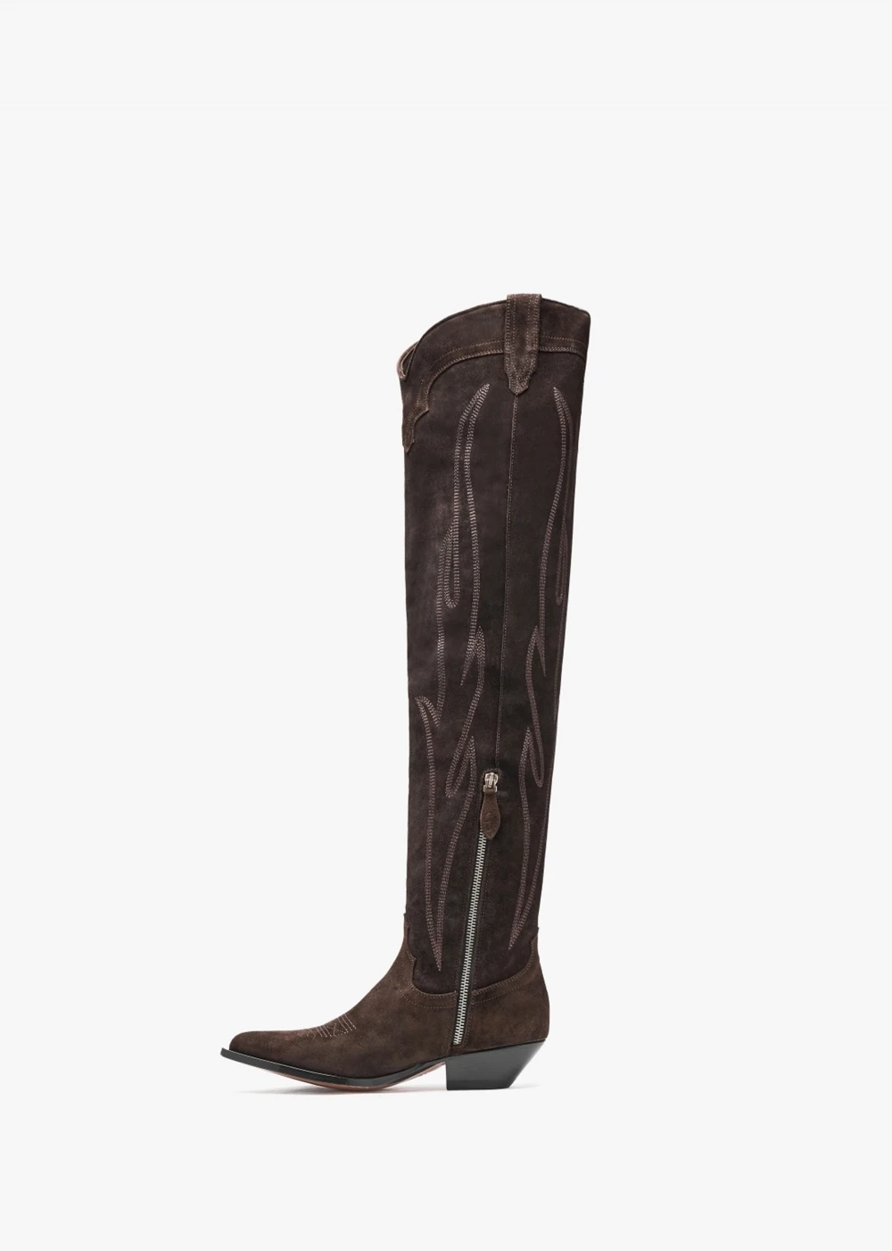 The ‘Hermosa’ over the knee boots are part of the New Season collection from Sonora. This classic ‘Western’ inspired style is the perfect addition to your boot collection. Crafted from a premium suede upper with luxurious leather lining and part leather sole. The classic pointed toe and stacked heel make up the silhouette. Pull tabs add detail to the top-line, subtle tonal top stitching, raised seaming and embroidered design feature to the upper. Signature Sonora branding is seen to the foot-bed and sole.