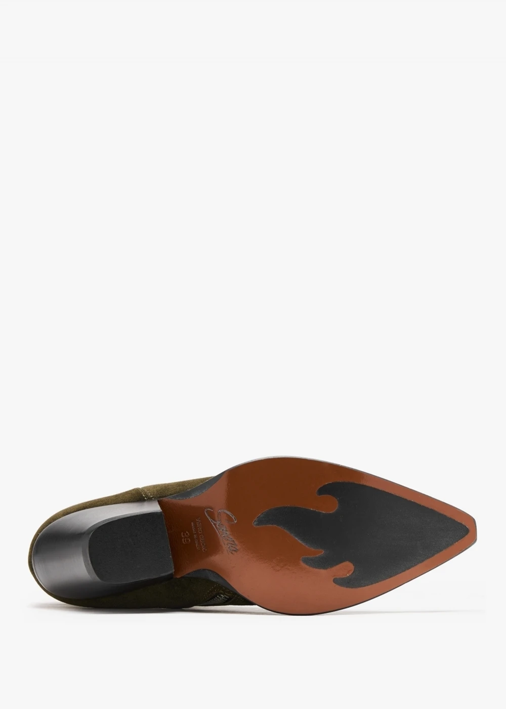 Add these ‘Western’ inspired ankle boots from Sonora to your boot collection. This New Season style is crafted from a premium suede upper with luxurious leather lining and a part leather sole. Zip fastening to the inner leg creates an easy wear. The classic pointed toe and stacked heel make up the silhouette. Tonal top stitching, raised seaming and an embroidered designer to the upper add detail. Signature Sonora branding is seen to the foot-bed, sole and zip pull.
