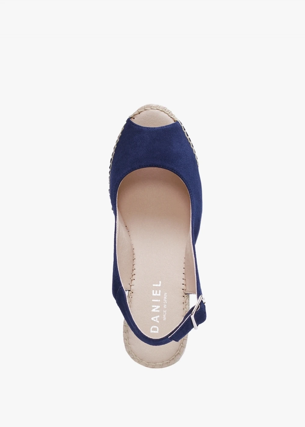 The wedge espadrille is a classic style and Summer wardrobe staple. This version from Daniel Footwear is the perfect example. The ‘Kate’ wedge sandals are crafted from a premium suede upper with synthetic lining, jute trim and a comfy rubber sole. An easy to wear slip in style featuring buckle fastening sling back. The peep toe and mid wedge heel make up the silhouette. Signature Daniel branding is seen to the foot-bed.