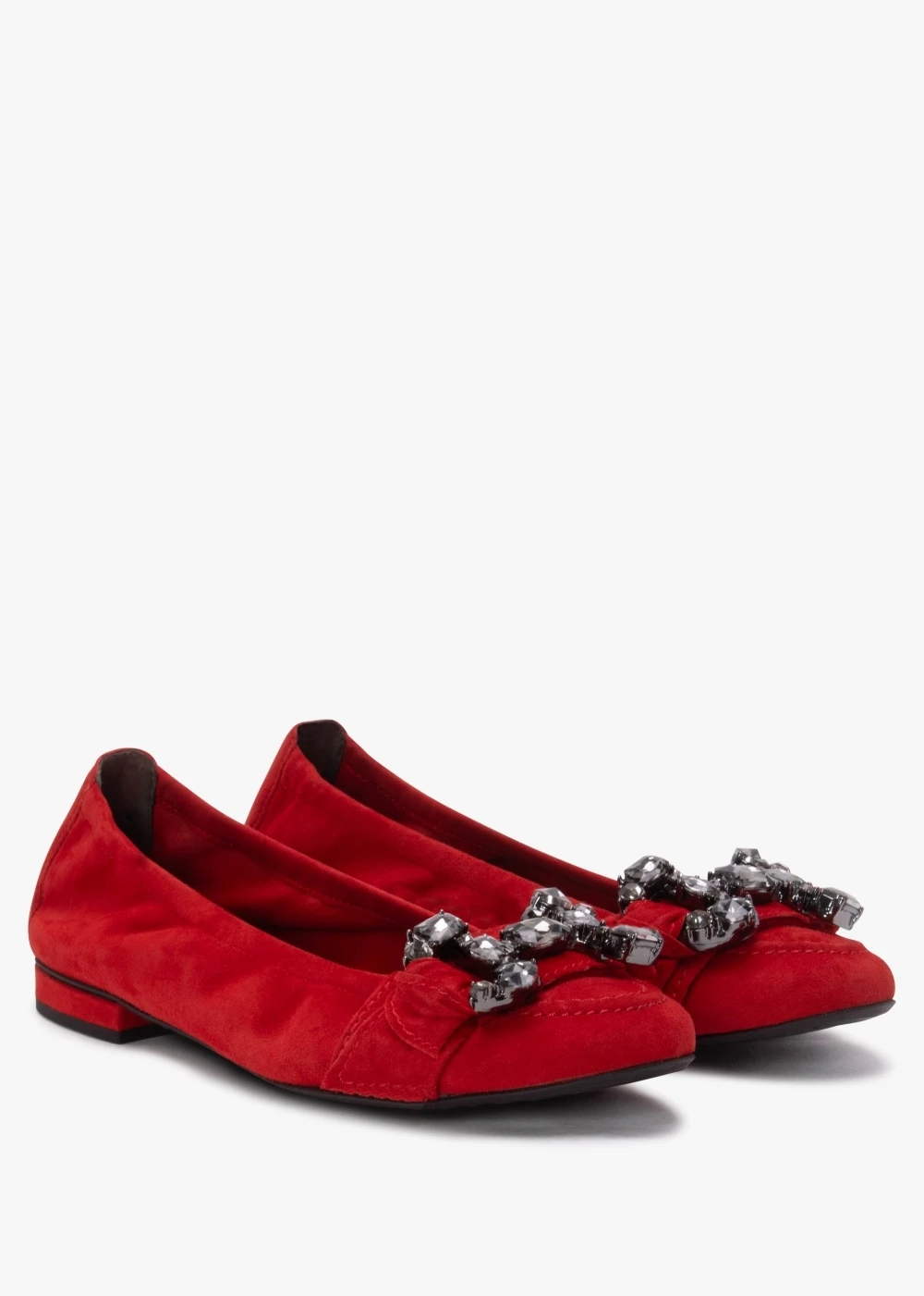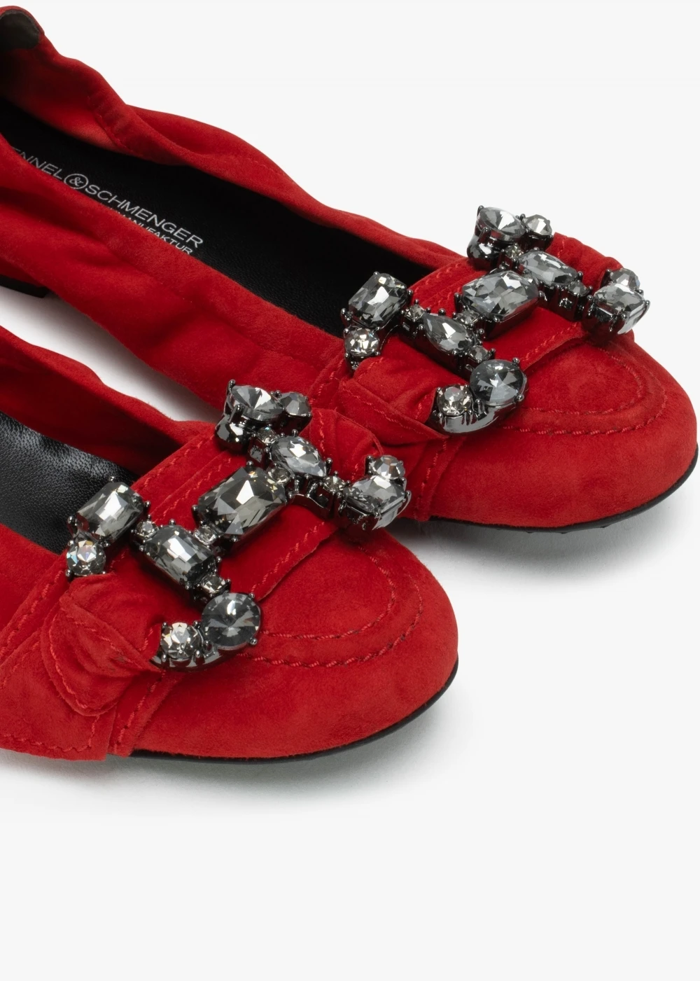 The āMalu Jewelā pumps are part of the New Season collection from Kennel & Schmenger. This everyday flat style is crafted from a premium suede upper with luxurious leather lining and comfy rubber sole. A easy to wear slip on style featuring elasticated top-line. Statement jewel embellishment adds detail to the toe. Signature Kennel & Schmenger branding is seen to the foot-bed and sole.