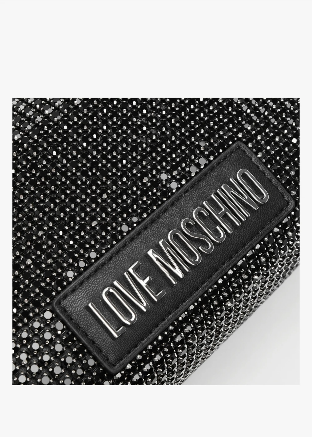 The ‘Bling Bling’ shoulder bag is part of the New Season collection from Love Moschino. This occasional evening accessory is crafted from a glitzy diamante chain mail style outer with polished silver tone hardware. The secure top zip fastening reveals the main compartment featuring handy inner zip and slot pockets. Carry by either of the detachable straps. Signature Love Moschino branding is seen throughout.