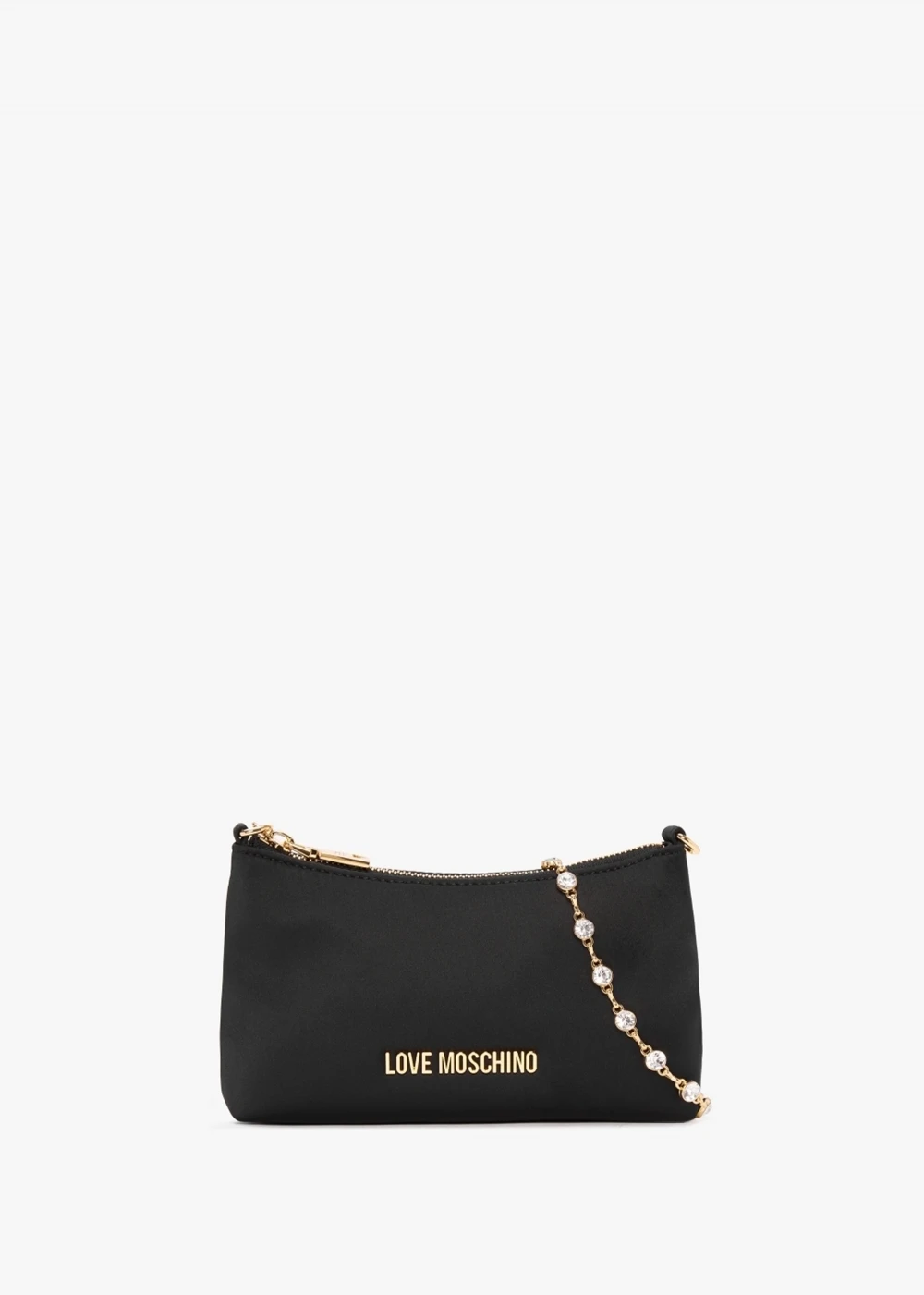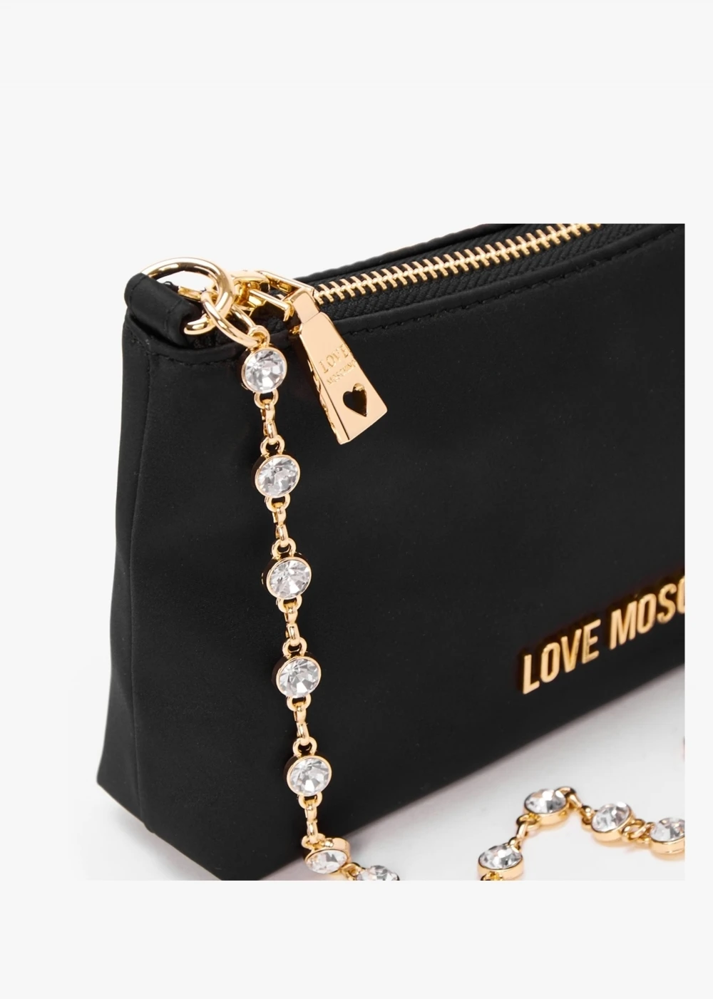 The ‘Dimante Strap’ shoulder bag is part of the New Season collection from Love Moschino. This occasion evening style is crafted from a satin look fabric featuring polished gold tone hardware. The secure top zip fastening reveals the main compartment featuring handy inner slot pocket. Carry by the jewel embellished gold chain handle. Signature Love Moschino branding is seen throughout.