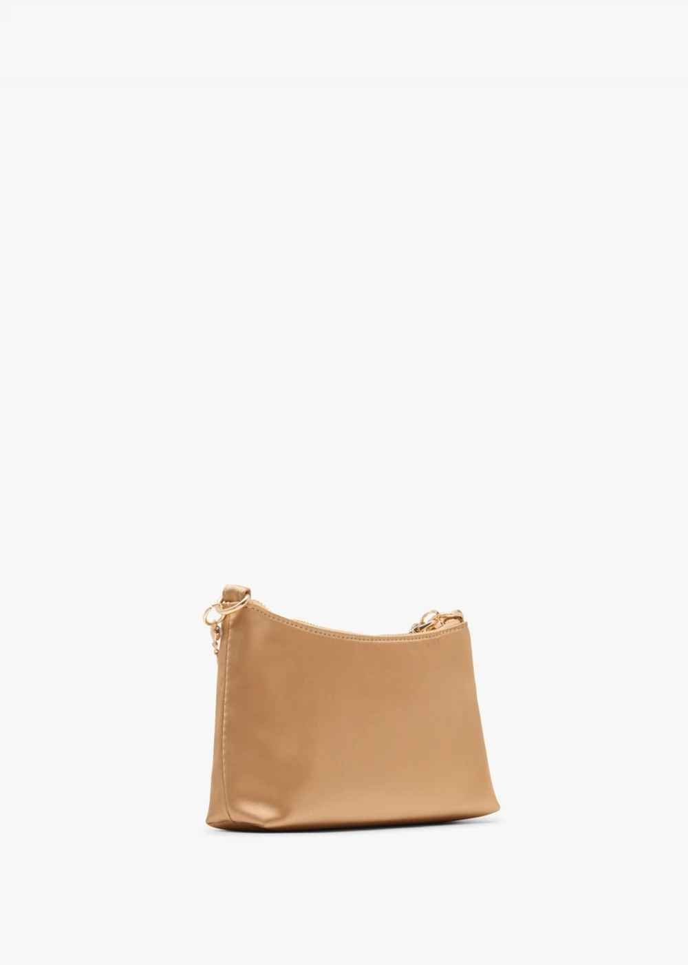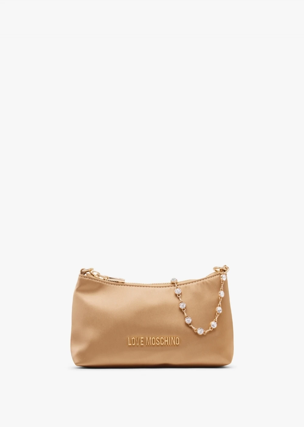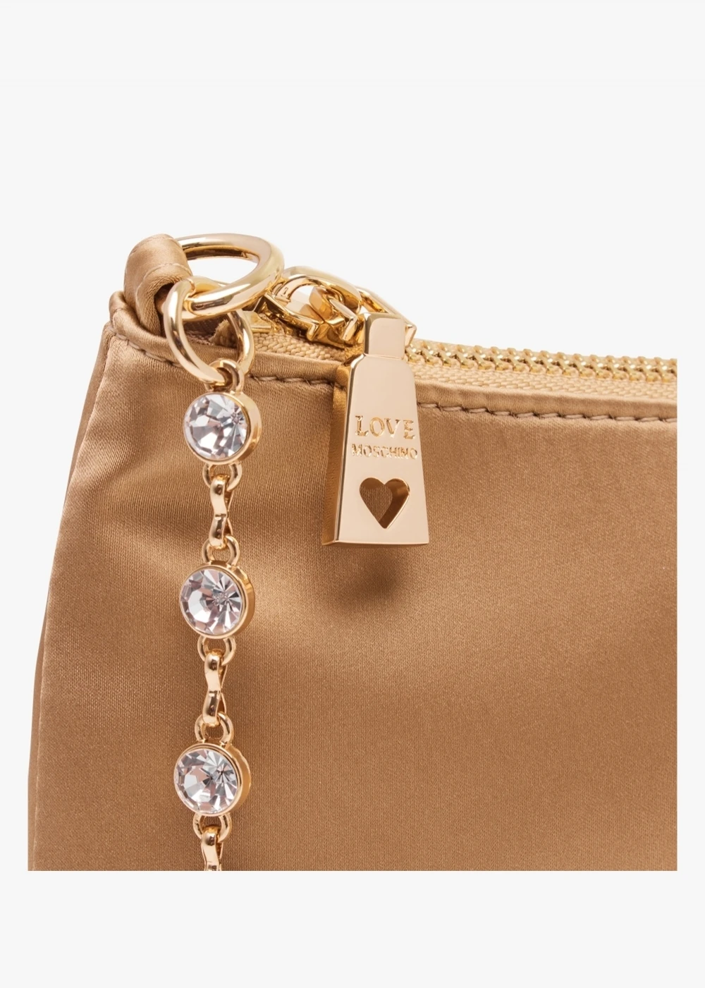 The ‘Dimante Strap’ shoulder bag is part of the New Season collection from Love Moschino. This occasion evening style is crafted from a satin look fabric featuring polished gold tone hardware. The secure top zip fastening reveals the main compartment featuring handy inner slot pocket. Carry by the jewel embellished gold chain handle. Signature Love Moschino branding is seen throughout.