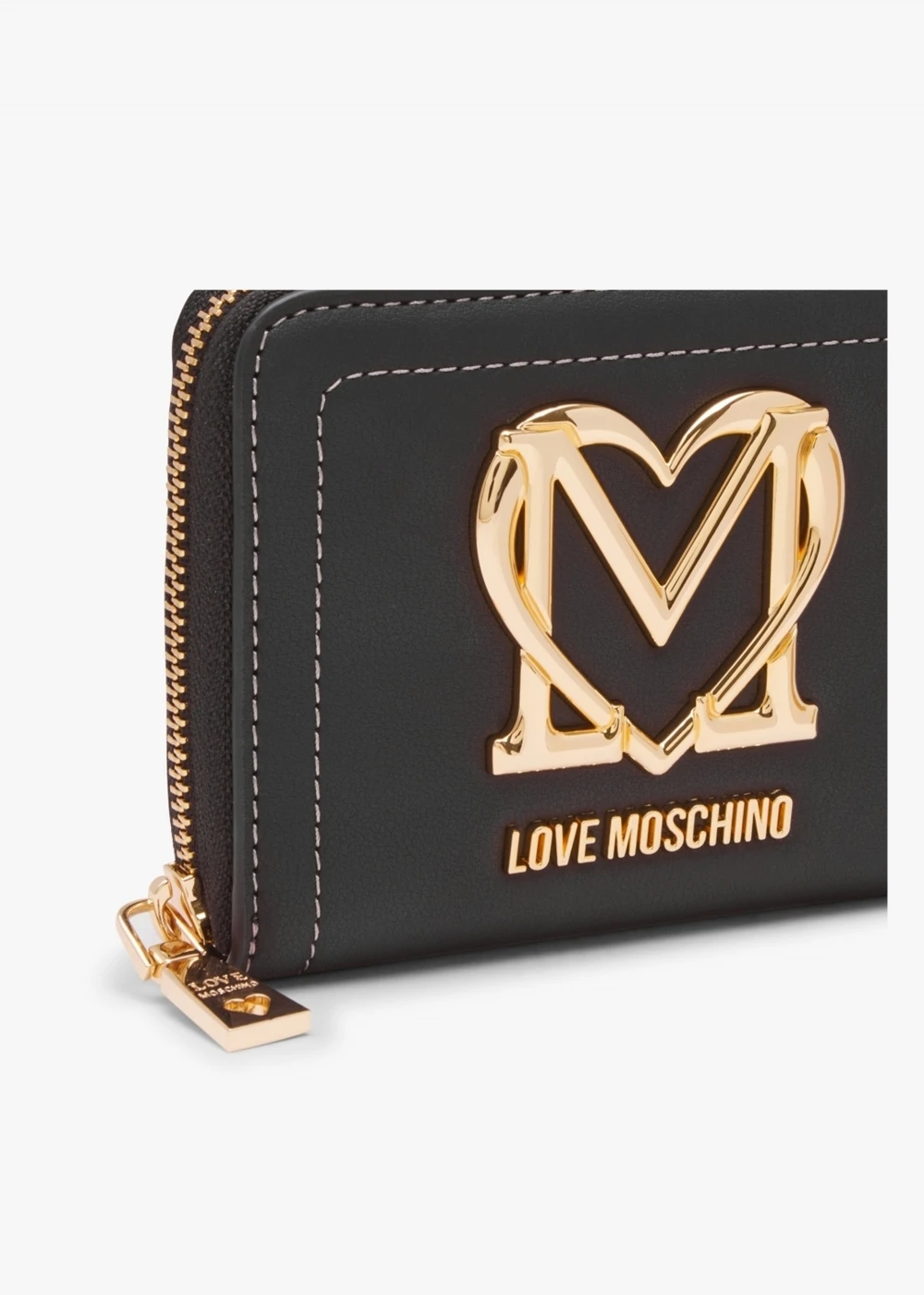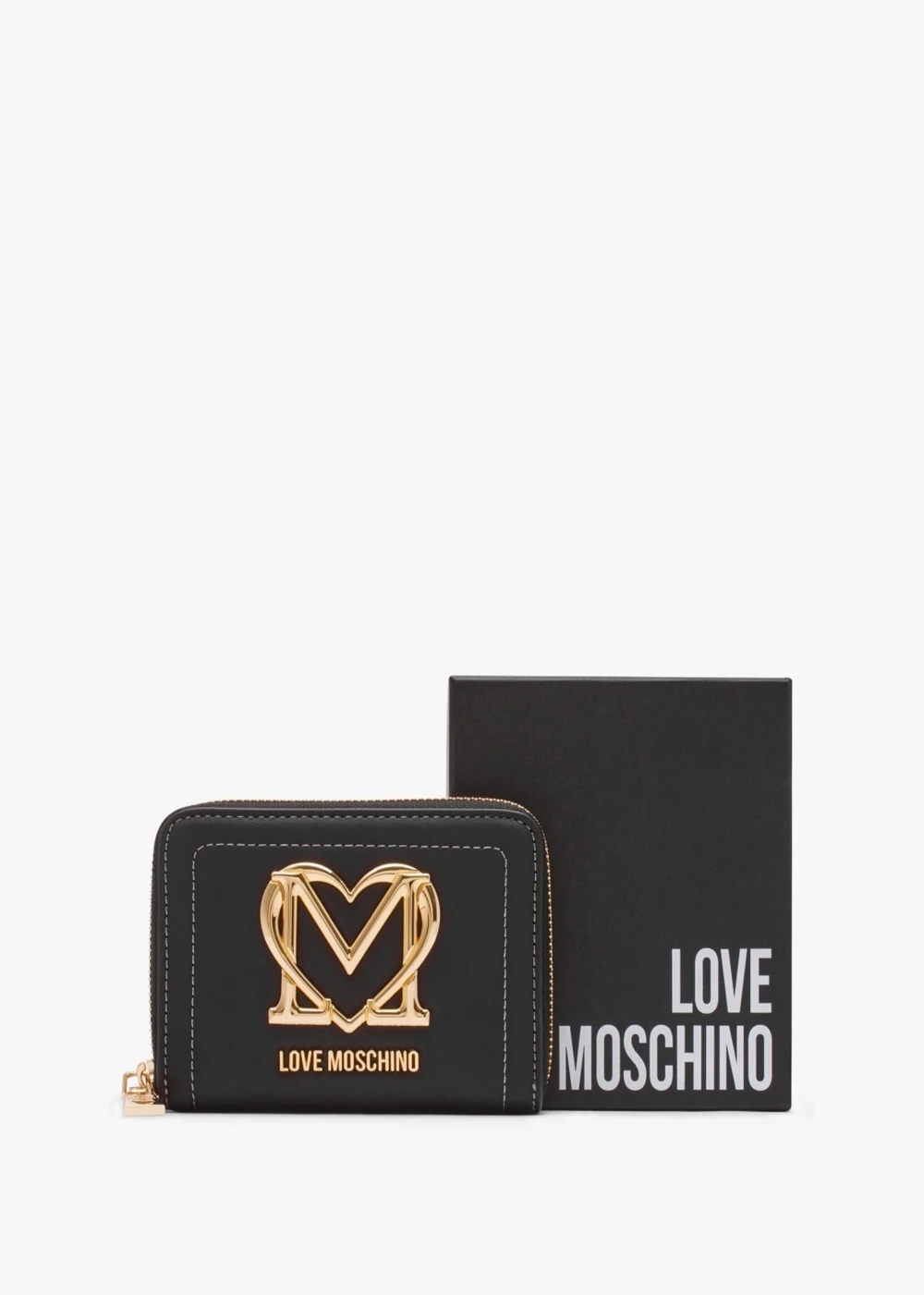 Keep all your coins notes and cards in check this New Season with the ‘Small Super Gold’ wallet from Love Moschino. This everyday accessory is crafted from premium PU with polished gold tone hardware. The secure zip around fastening reveals the multiple handy compartments. Statement heart and ‘M’ motif add detail as well as contrasting top stitching. Signature Love Moschino branding is seen throughout.