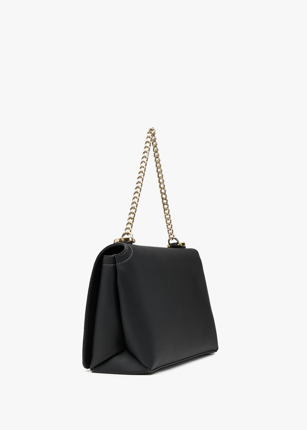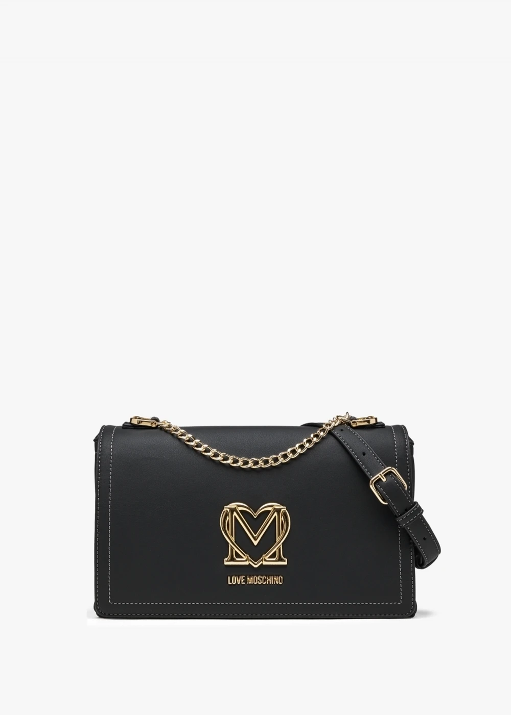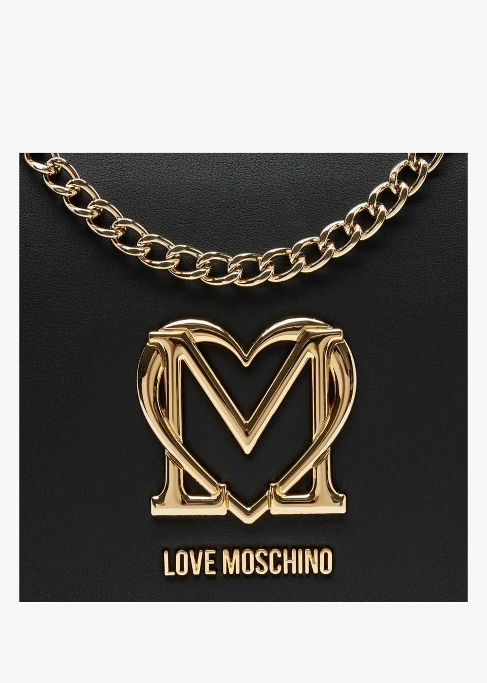 The ‘Super Gold’ shoulder bag from Love Moschino is the perfect everyday style. Crafted from premium PU with polished gold tone accents. The secure magnetic snap front flap reveals the main compartment featuring handy inner zip and slot pocket. Carry by the curb chain handle or the detachable PU strap. Contrasting tonal top stitching adds detail as well as classic logo hardware. Signature Love Moschino branding is seen throughout.