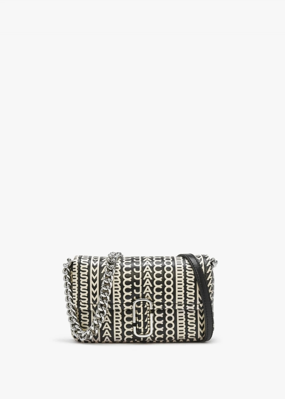 ‘The Monogram Leather J Marc Mini’ is a new take on the Marc Jacobs signature ‘J Marc’ shoulder bag, featuring the same classic details as the original but redesigned in a soft lambs leather debossed monogram design with polished silver tone hardware for a plush feel. It fastens with a secure magnetic snap closure and includes one interior zip pocket, three interior card slots, and one back slip pocket. With three ways to wear, go from formal to casual by swapping the chain shoulder strap with the leather crossbody strap, or carry it strapless as a clutch for a true evening moment. Classic double ‘J’ logo adds detail. Signature Marc Jacobs branding is seen throughout.
