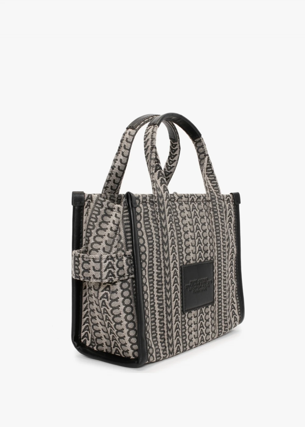 Add ‘The Monogram Mini’ tote bag from Marc Jacobs to your handbag collection. This go to carryall style is crafted from a premium woven jacquard featuring silver tone accents. The secure top zip fastening reveals the main compartment and handy inner slot pocket. Carry by the grab handles or the detachable strap. Classic printed logo adds detail to the front of the bag. Signature Marc Jacobs branding is seen throughout.