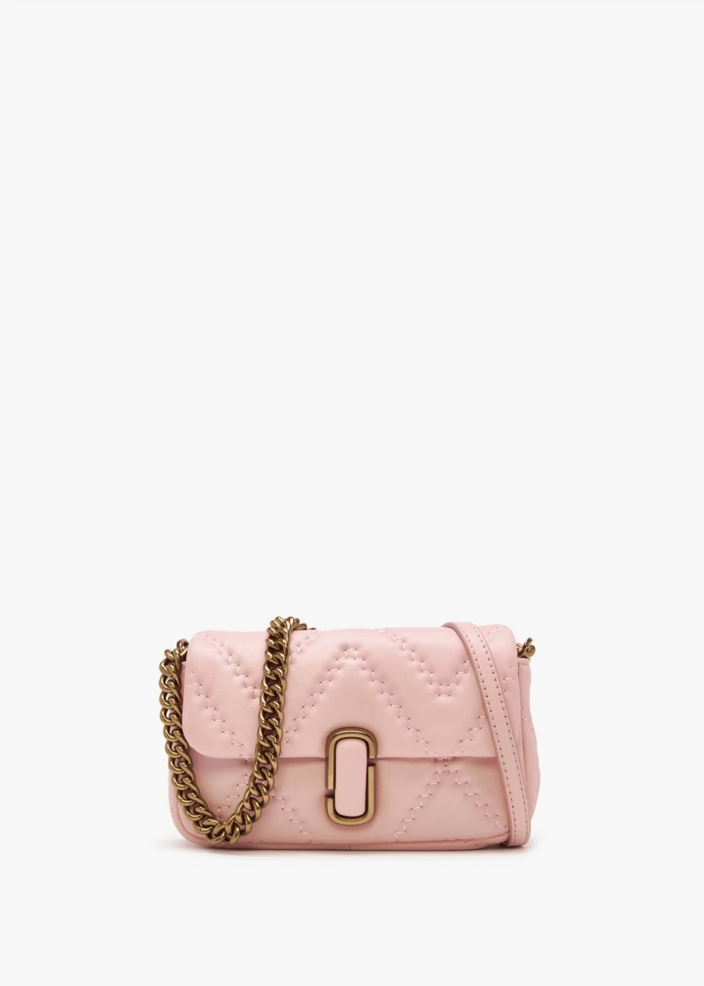 ‘The Quilted Leather J Marc Mini’ is a new take on the Marc Jacobs signature ‘J Marc’ shoulder bag, featuring the same classic details as the original but redesigned in a quilted, light-filled soft lamb leather with brushed gold tone hardware for a plush feel. It fastens with a secure magnetic snap closure and includes one interior zip pocket, three interior card slots, and one back slip pocket. With three ways to wear, go from formal to casual by swapping the chain shoulder strap with the leather crossbody strap, or carry it strapless as a clutch for a true evening moment. Classic double ‘J’ logo adds detail. Signature Marc Jacobs branding is seen throughout.