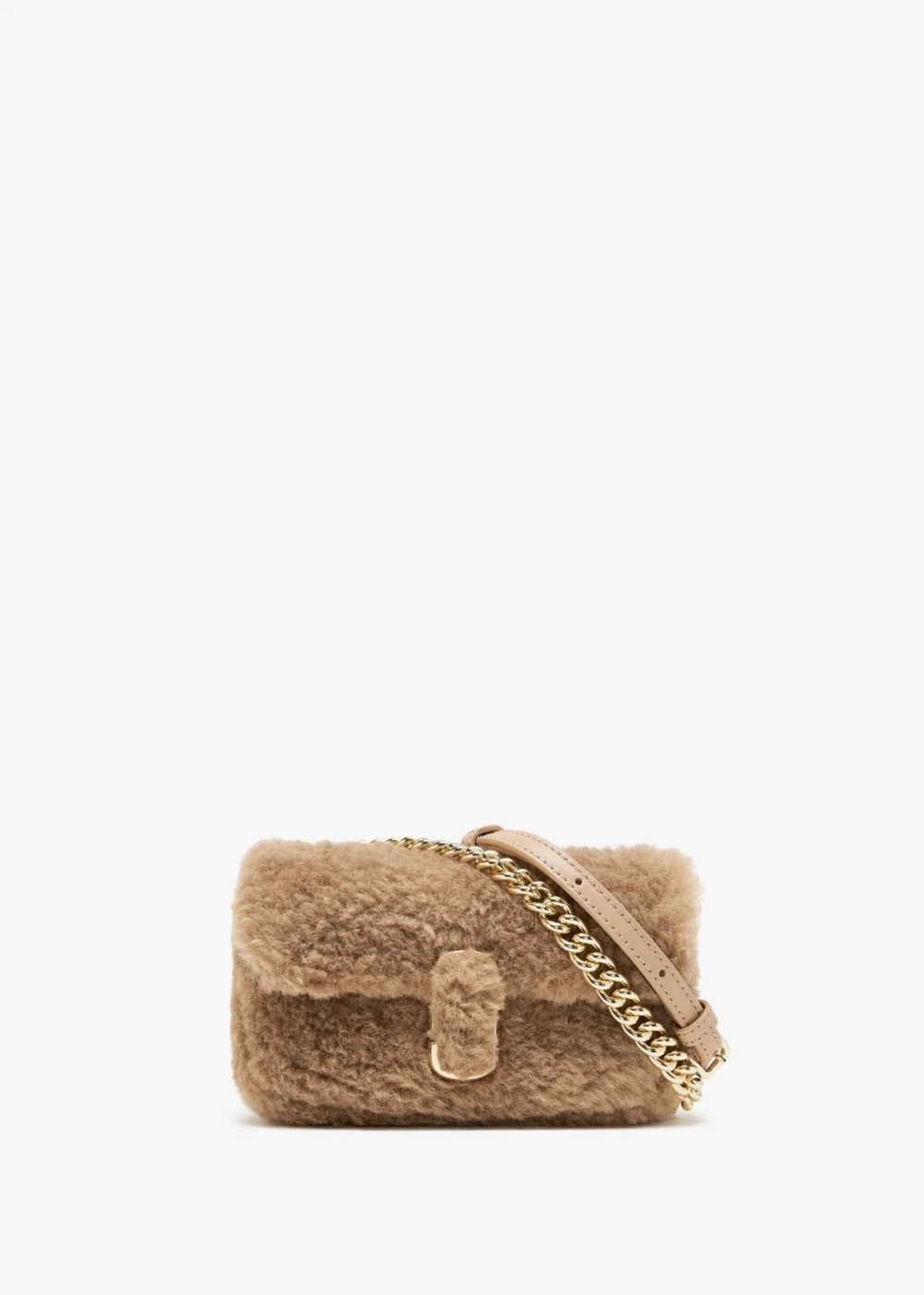 ‘The Teddy J Marc Mini’ is a new take and mini version of the Marc Jacobs signature ‘J Marc’ shoulder bag, featuring the same classic details as the original but redesigned in a teddy fleece style fabric with gold tone hardware for a plush feel. It fastens with a secure magnetic snap closure and includes interior zip and slot pockets. With three ways to wear, go from formal to casual by swapping the chain shoulder strap with the leather crossbody strap, or carry it strapless as a clutch for a true evening moment. Classic double ‘J’ logo adds detail. Signature Marc Jacobs branding is seen throughout.