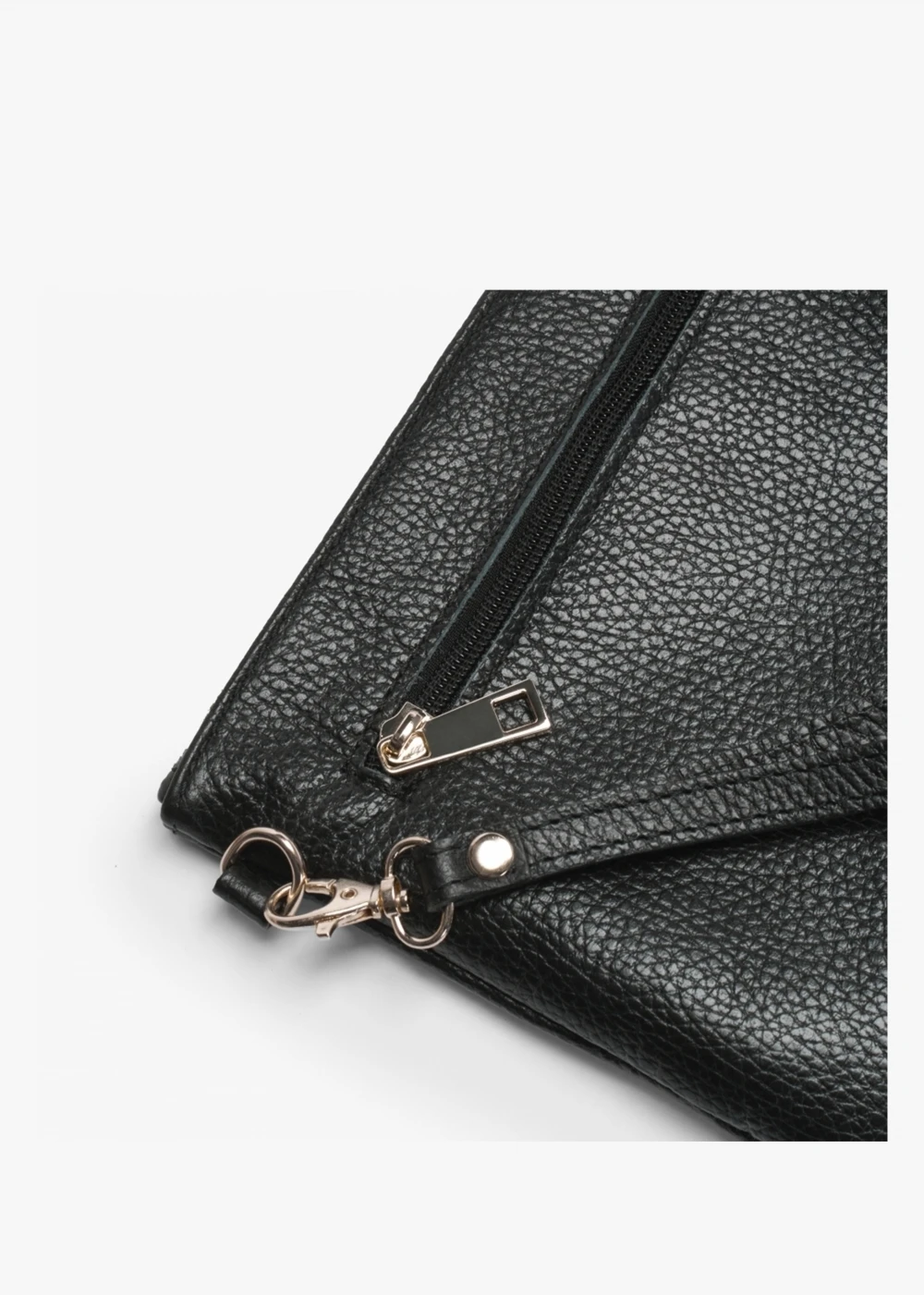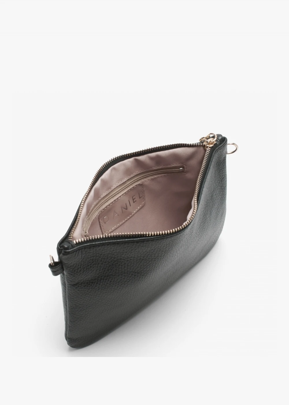 The ‘Noale’ clutch is part of the New Season collection from Daniel Footwear. This day to night accessory is crafted from premium pebbled leather with polished gold tone hardware. The secure top zip fastening with tassel zip pull reveals the main compartment with handy inner zip pocket, exterior zip fastening pocket also features. Carry by the wristlet strap or the detachable long strap. Signature Daniel branding is seen to the inside of the bag.