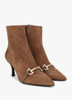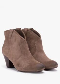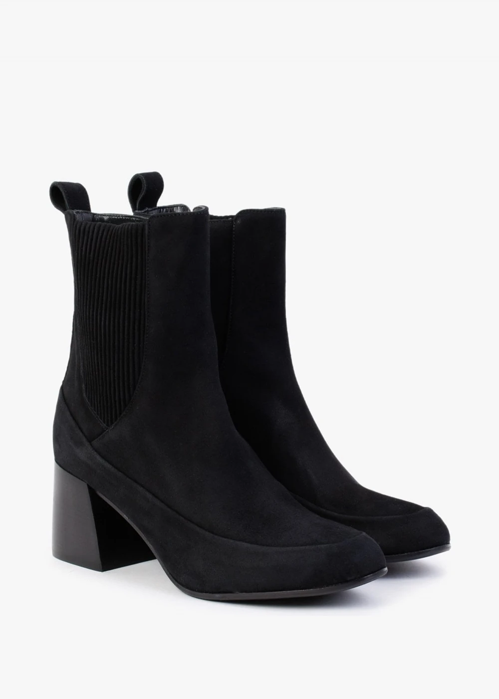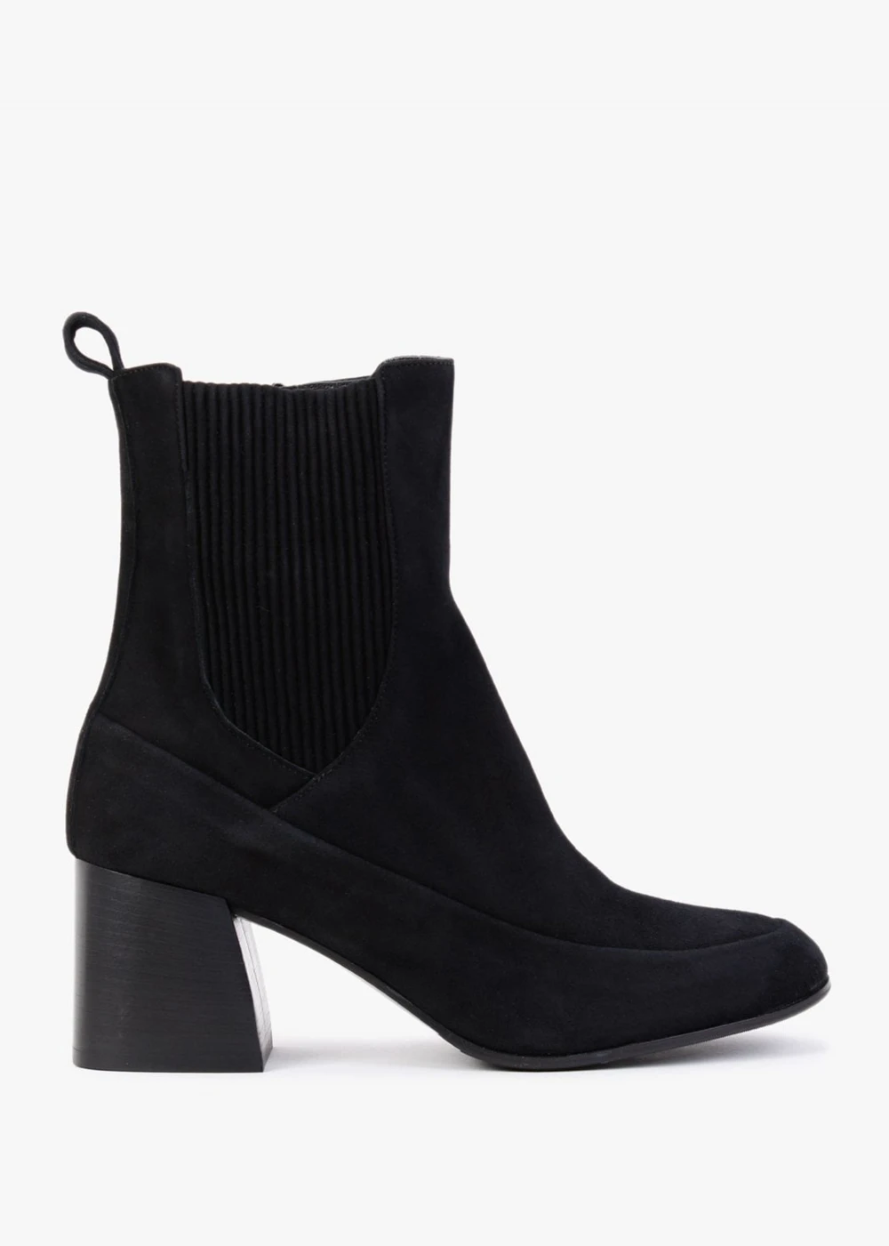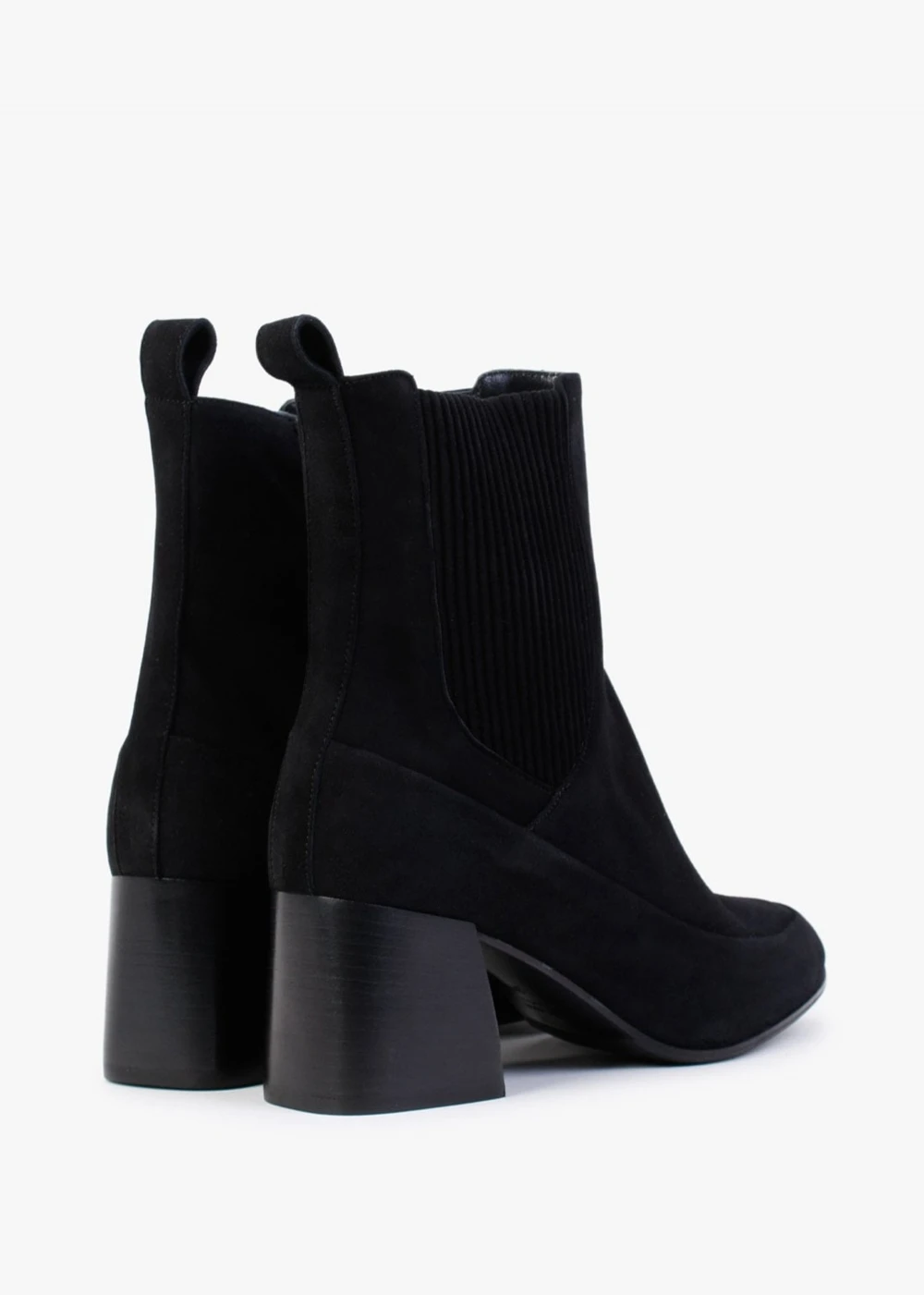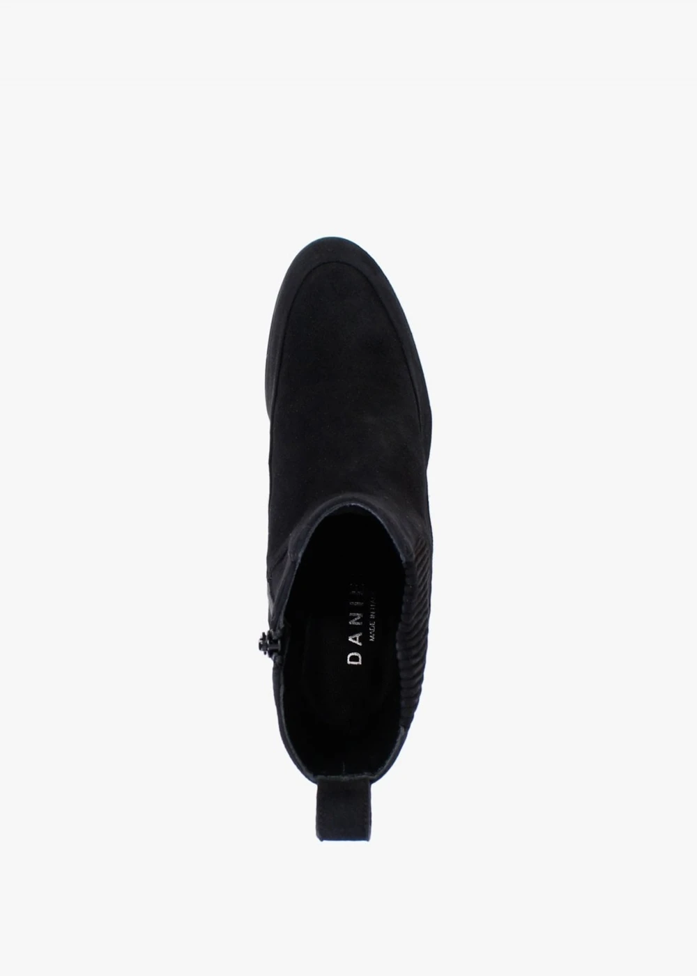 Add the ‘Nocky’ ankle boots from Daniel Footwear to your boot collection. This New Season style is crafted from premium suede with luxurious leather lining and a comfy rubber sole. Zip fastening to the inner leg creates an easy wear. Pull tab and tonal top stitching add detail as well as elasticated insert. Classic round toe and mid block heel make up the silhouette. Signature Daniel branding is seen to the foot-bed.