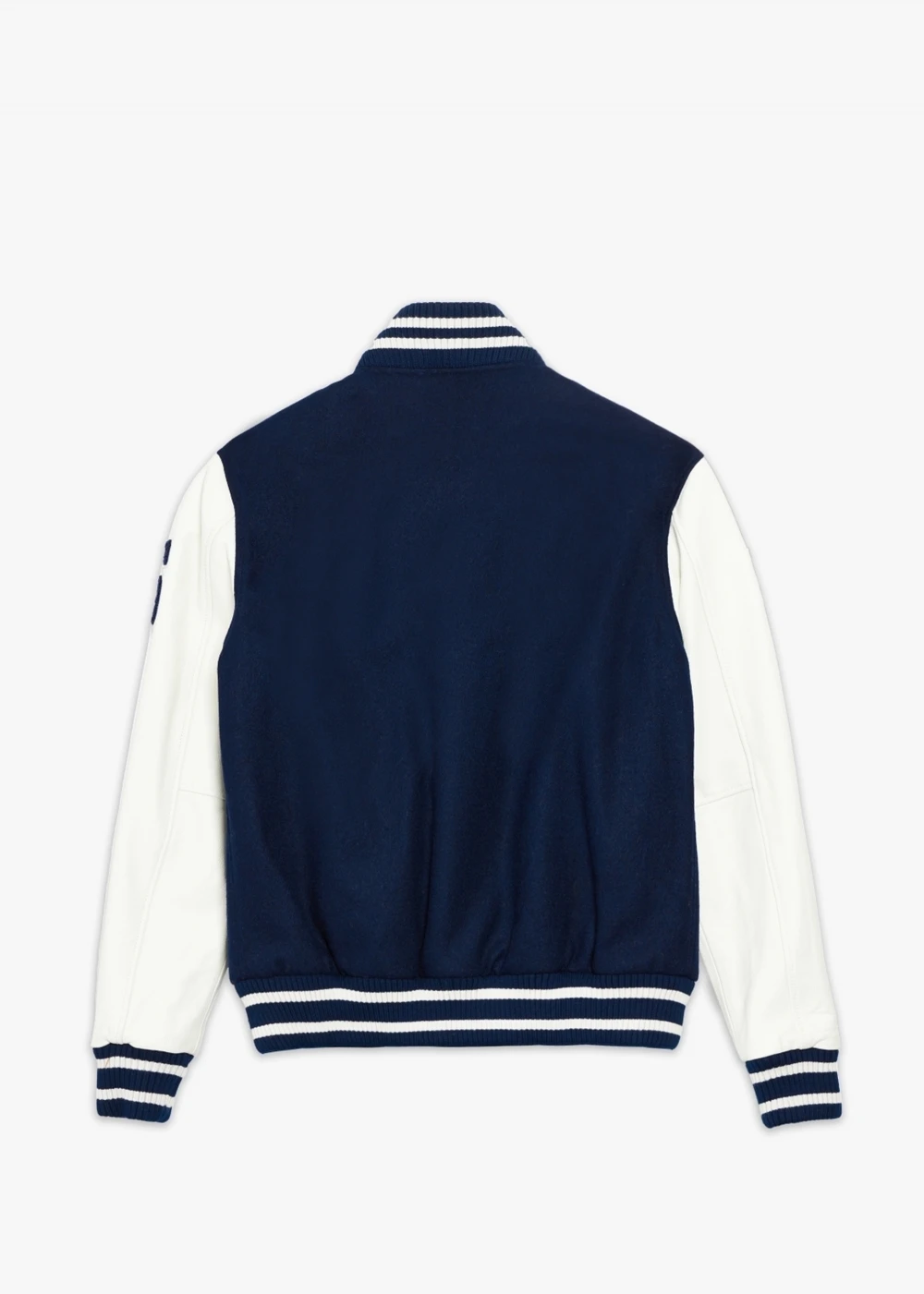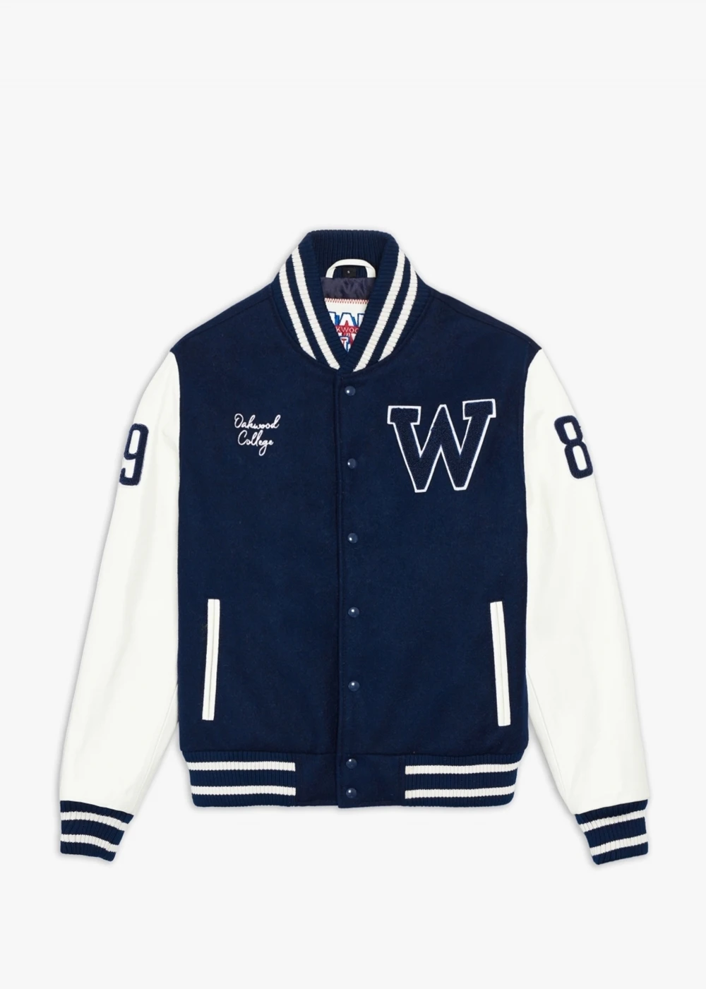 Add the ‘Collage Bi’ oversized varsity style jacket from Oakwood to your New Season wardrobe. This classic style is crafted from premium wool mix with polyester padded lining and luxurious leather sleeves. The popper fastening center front creates an easy wear. Pockets feature to the outer as well as handy zip pocket to the inner lining. Bold applique adds detail as well as embroidery. Signature Oakwood branding is seen throughout.
