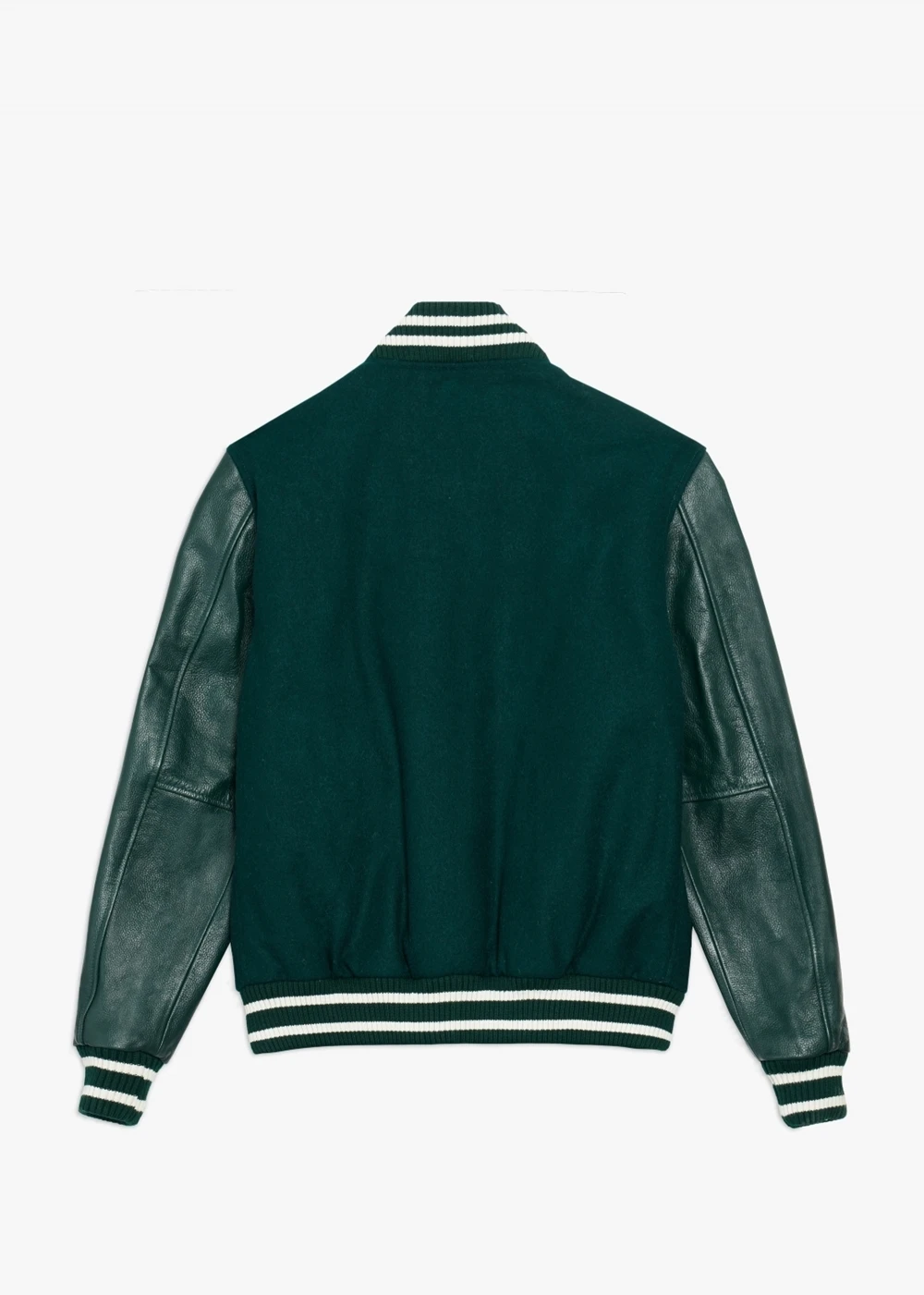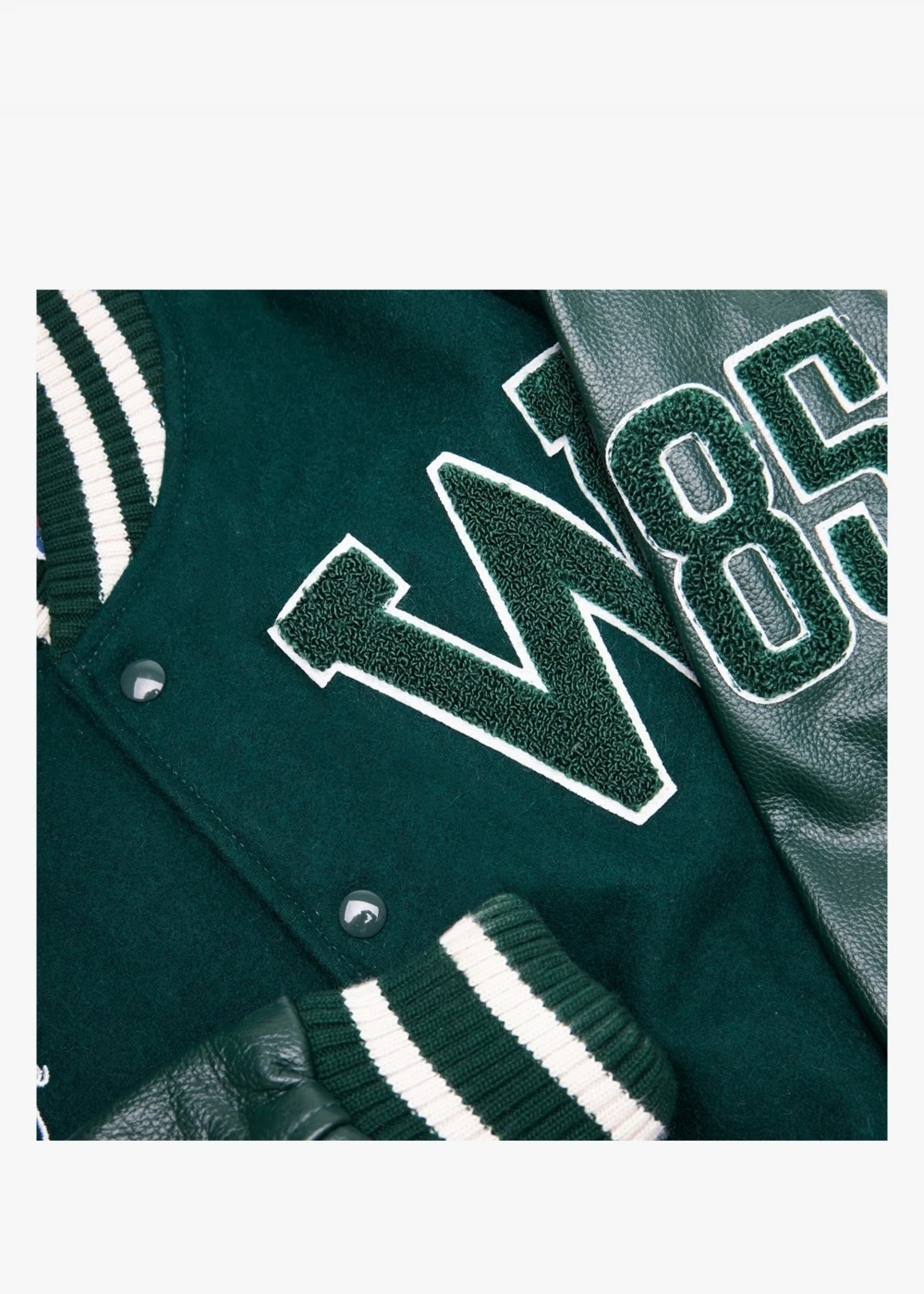 Add the ‘Collage’ oversized varsity style jacket from Oakwood to your New Season wardrobe. This classic style is crafted from premium wool mix with polyester padded lining and luxurious leather sleeves. The popper fastening center front creates an easy wear. Pockets feature to the outer as well as handy zip pocket to the inner lining. Bold applique adds detail as well as embroidery. Signature Oakwood branding is seen throughout.