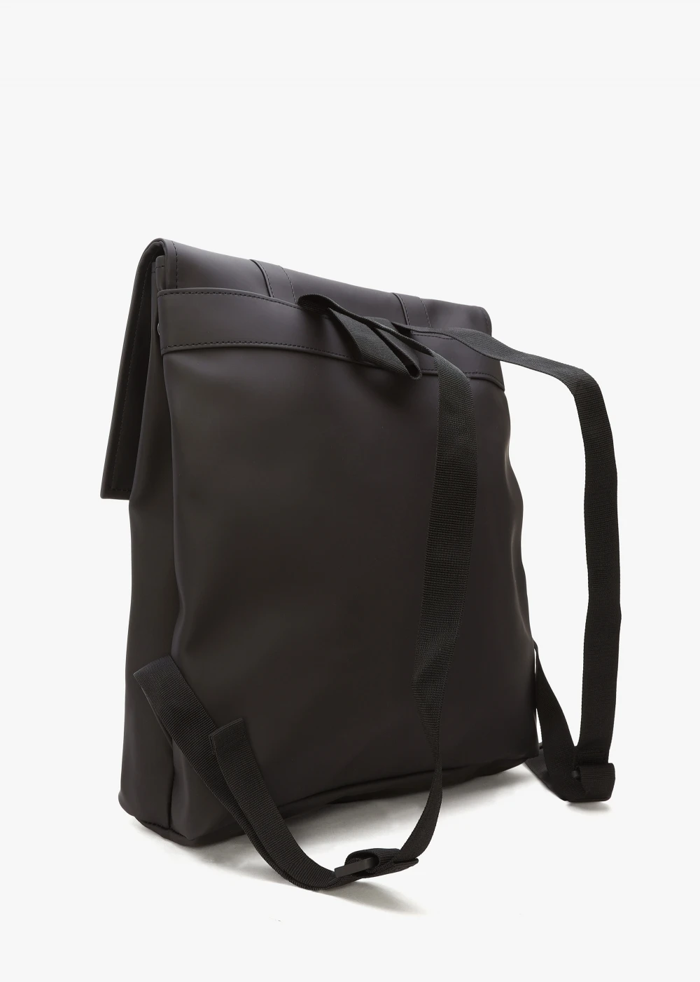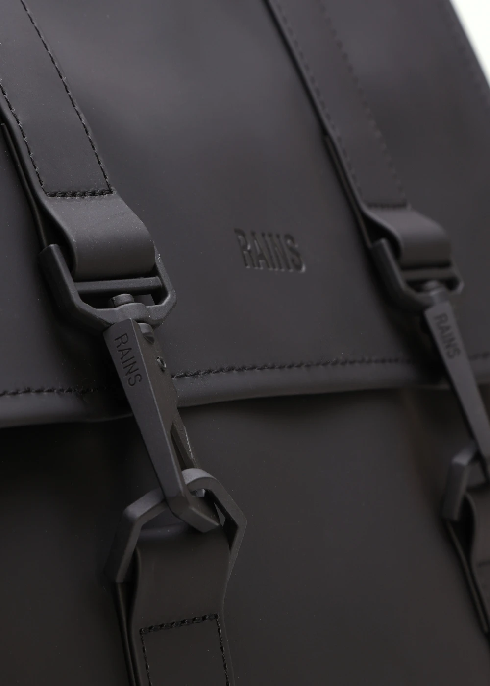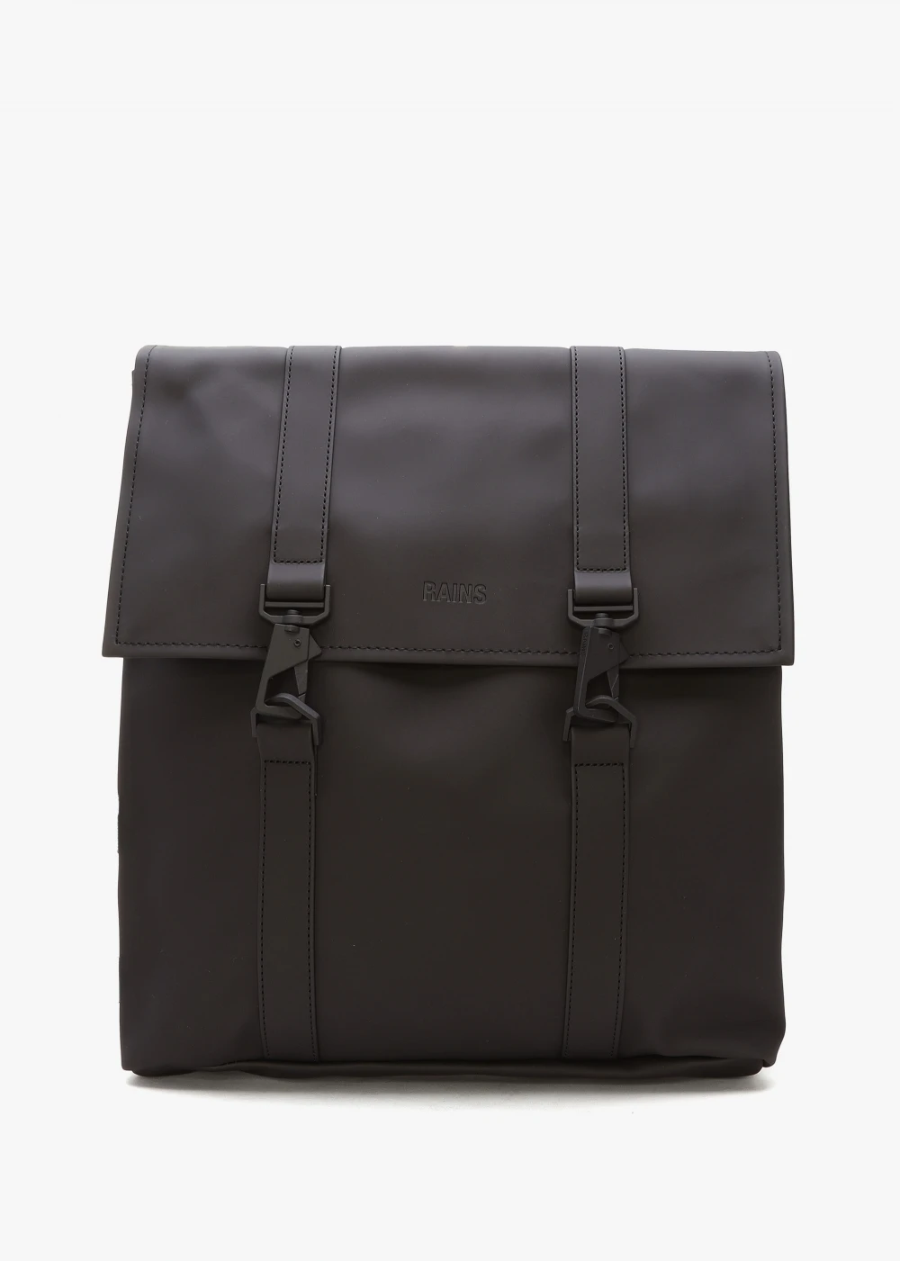 The unisex ‘Mini MSN’ backpack from RAINS is inspired by the classic old school backpack. This New Season style is crafted from RAINS’ signature waterproof PU fabric, engineered for carrying strength and durability with a smooth finish. Matt black tone hardware adds detail. The secure double carabiner fastening front flap reveals the spacious main compartment with handy inner zip pocket. Carry by the adjustable webbed back straps to the top handle. RAINS branding adds detail throughout.