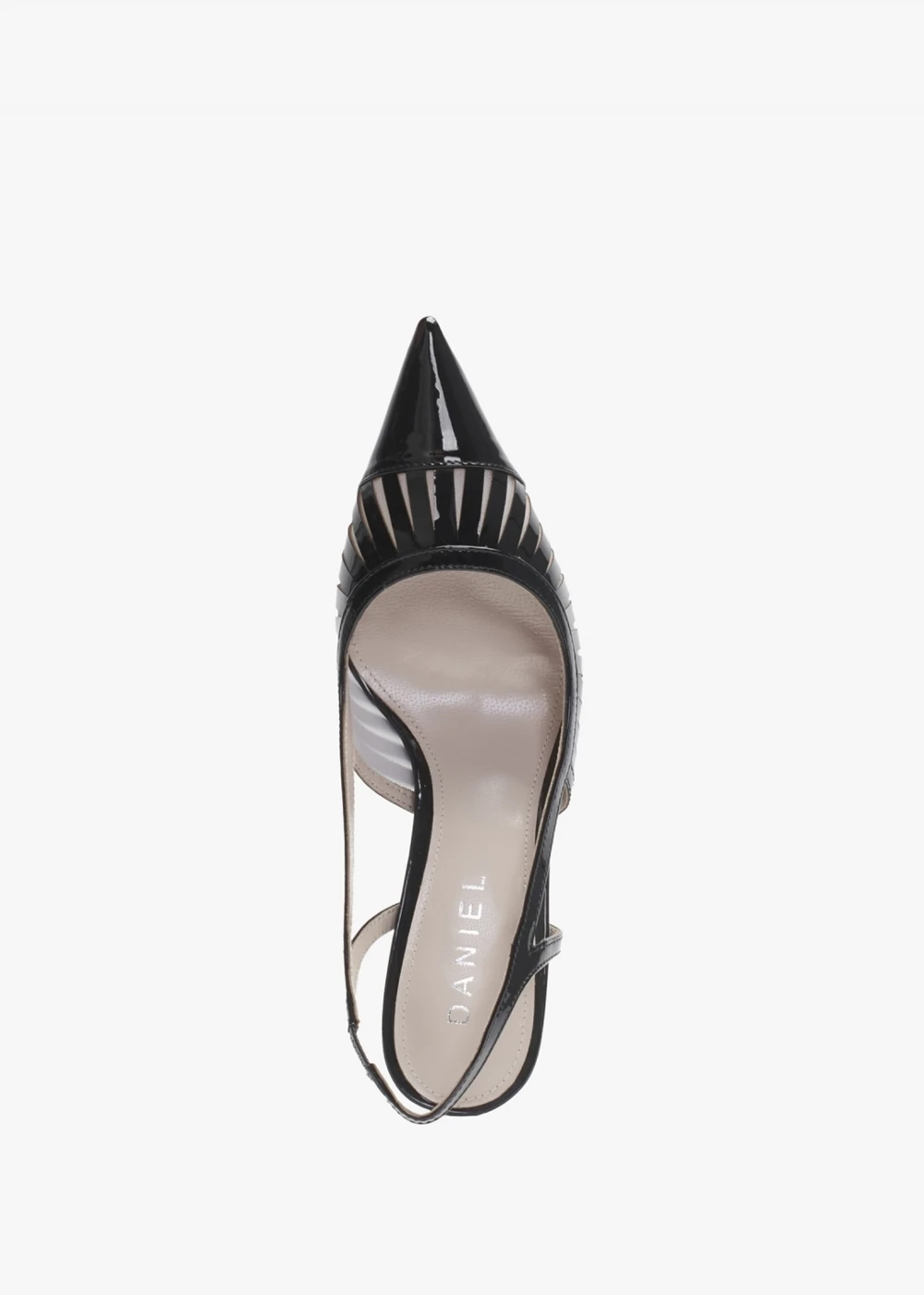 The āSabrinaā sling back heels are part of the New Season collection from Daniel Footwear. This day to night style is crafted from a premium patent leather upper with luxurious leather lining and a man-made sole. An easy to wear slip on style featuring elasticated sling back for added comfort. The classic pointed toe and elegant thin mid heel make up the silhouette. Mesh cut away design adds detail to the upper. Signature Daniel branding is seen to the foot-bed.
