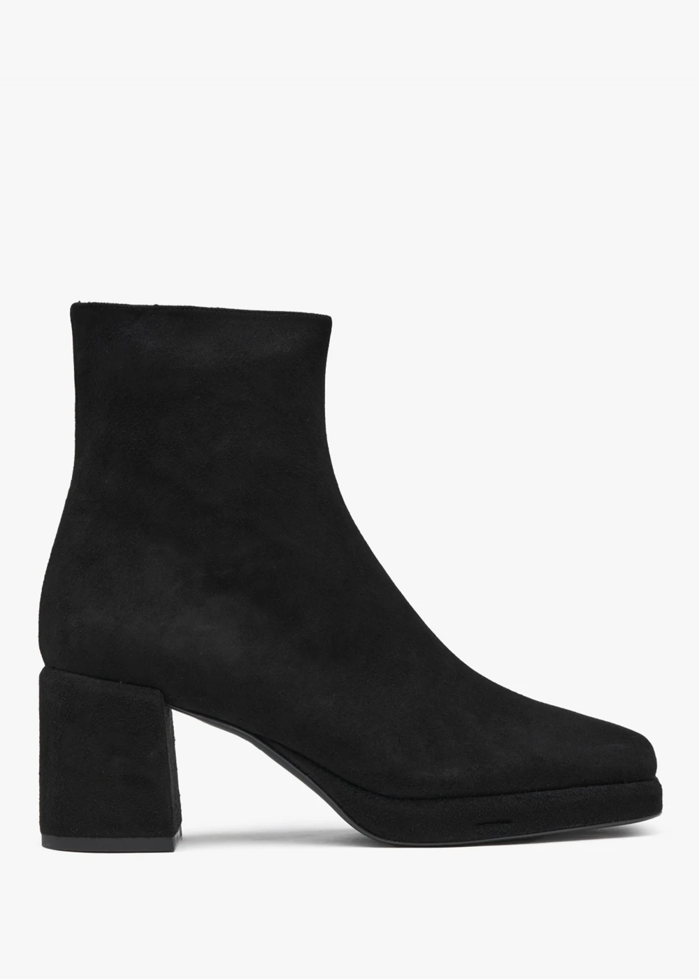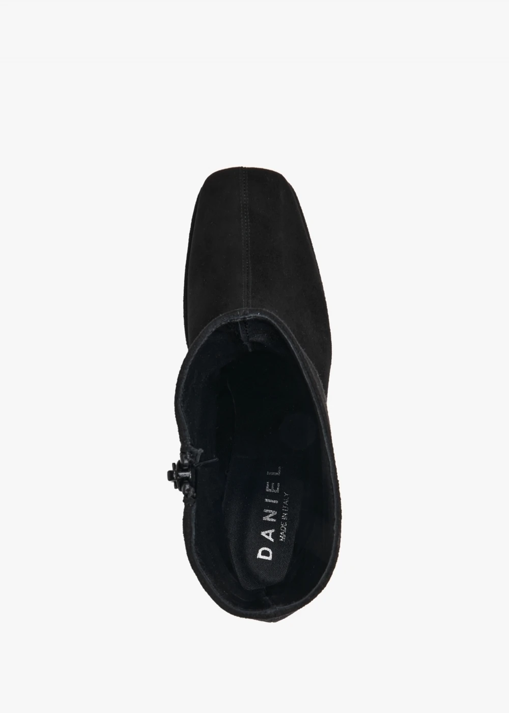 The āSalimaā ankle boots from Daniel Footwear will see you through Season after Season. A simple silhouette crafted from a premium suede upper with luxurious leather lining and man-made sole. Zip fastening to the inner leg creates an easy wear. The square toe, platform and block heel make up the silhouette. Signature Daniel branding is seen to the foot-bed.