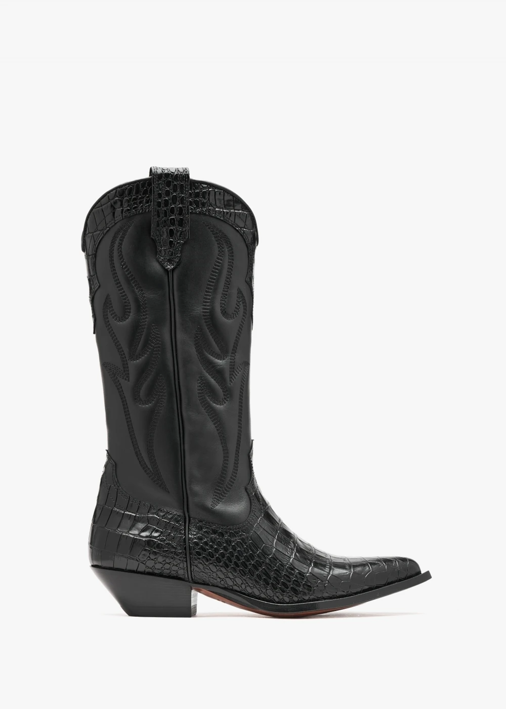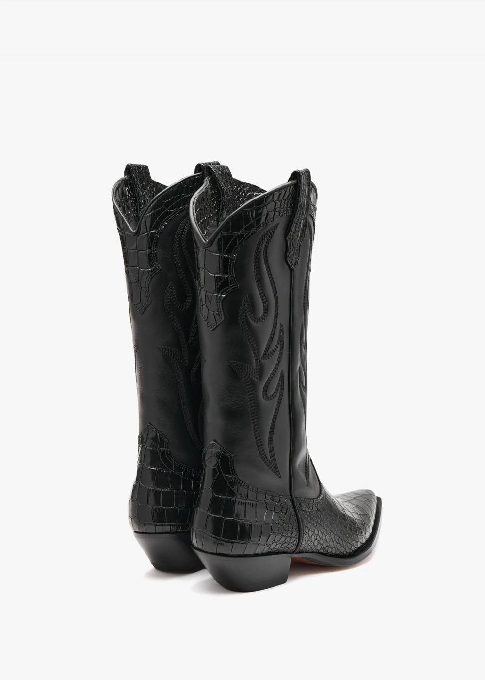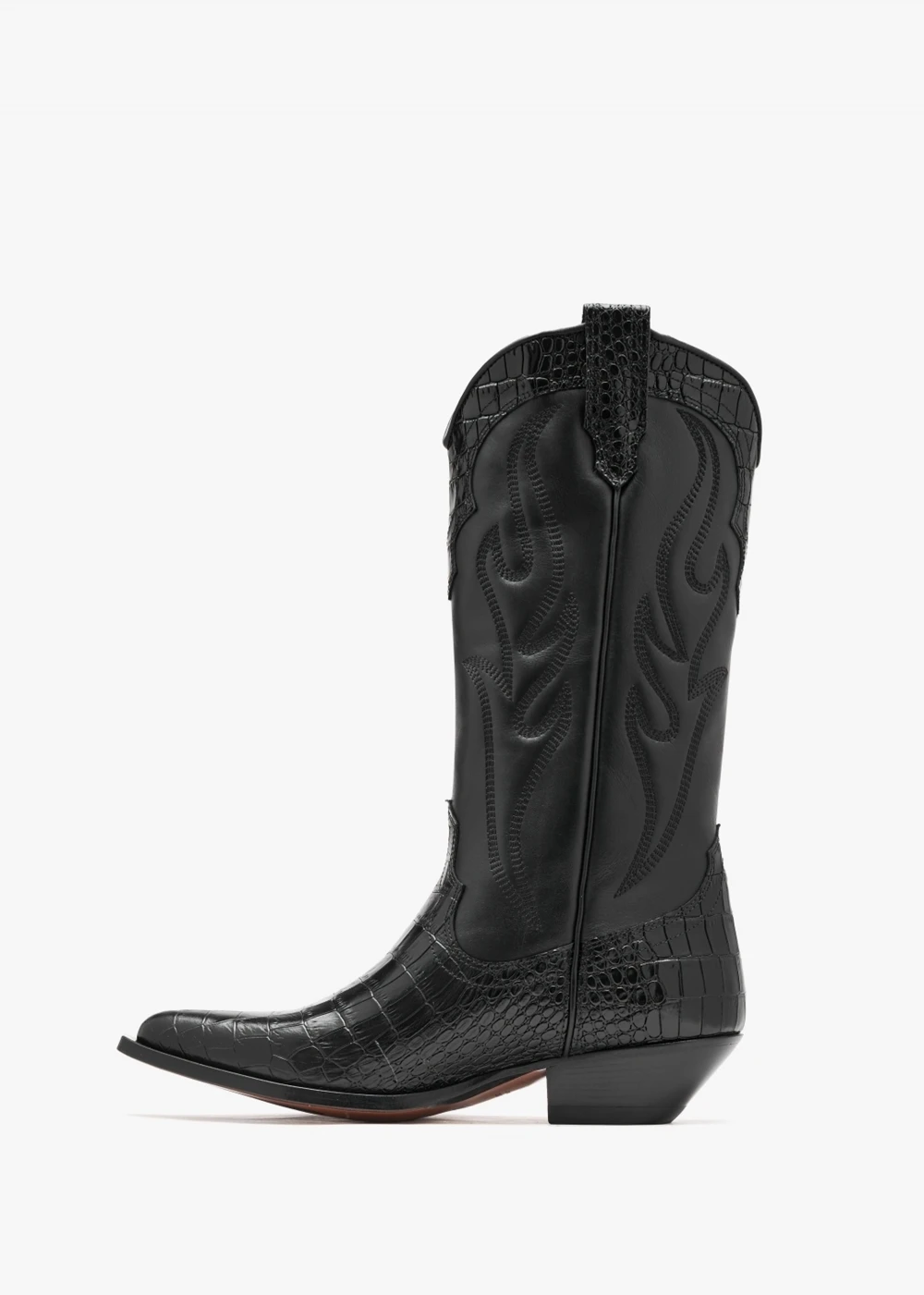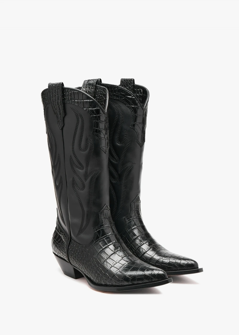 The ‘Santa Fe’ calf boots are part of the New Season collection from Sonora. This classic ‘Western’ inspired style is the perfect addition to your boot collection. Crafted from a premium leather upper with luxurious leather lining and part leather sole. The classic pointed toe and low stacked heel make up the silhouette. Pull tabs add detail to the top-line, tonal top stitching, raised seaming and moc croc inserts feature to the upper. Signature Sonora branding is seen to the foot-bed.
