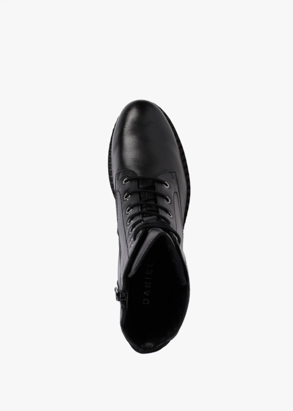 Add the ‘Sazzy’ ankle boots from Daniel Footwear to your New Season wardrobe. This everyday style is crafted from premium leather with part leather lining and a tracked rubber sole. Zip fastening to the inner leg creates an easy wear and the lace up upper ensures the perfect fit. Tonal top stitching and raised seaming add detail as well as statement embellishment to the back of the ankle. Signature Daniel branding is seen to the foot-bed.